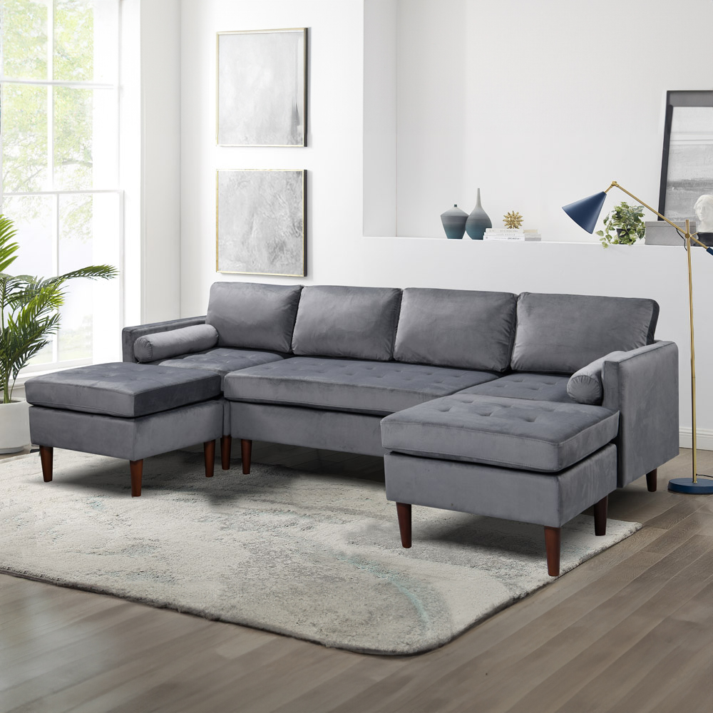 Introduce both luxury and comfort into your home with the Brooklyn 6-seater modular sofa. Upholstered in a stylish dark grey fabric, this sofa is the perfect addition to any living space. Effortlessly versatile, arrange the modular sections to meet your needs, easily moving the footstools to your desired position. The Brooklyn sofa comes complete with two tubular-shaped scatter cushions for added comfort and is finished with sturdy wooden legs for balance and stability.