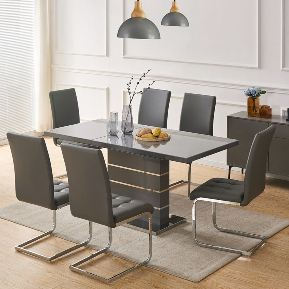 Introduce a touch of class to your dining area with the Brooklyn Dining Set. The centrepiece is a tempered glass table, extendable from 120cm to 160cm to accommodate extra guests. Accompanying the table are six grey faux leather chairs, each featuring a supportive, firm backrest. The chairs are finished with sturdy, steel chrome-effect legs for enhanced stability and support. With its superb design, this dining set is a fitting addition to any interior space.
