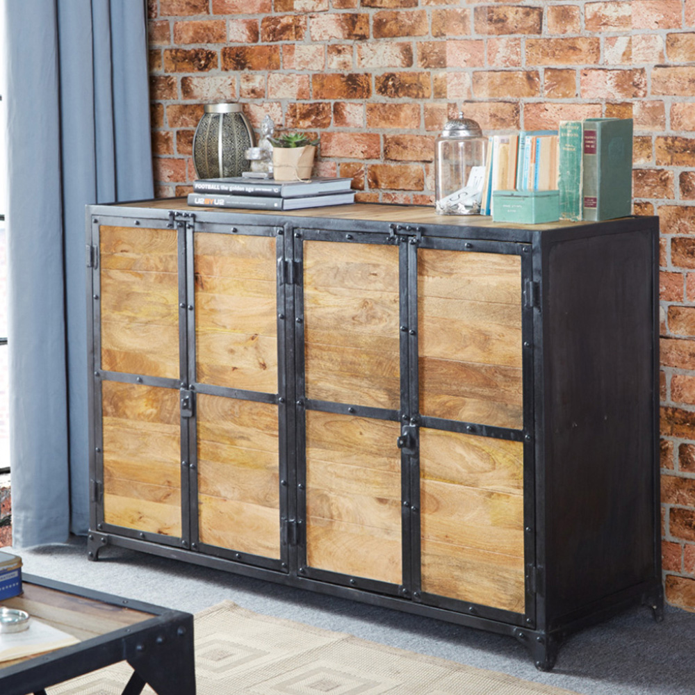 Transform your living space with this exquisite up-cycled reclaimed industrial sideboard, featuring a stunning blend of solid wood and metal elements. This piece not only serves as a functional storage solution but also adds a unique character to any room. Its striking appearance effortlessly complements a variety of interior styles, making it an ideal choice for those looking to enhance their decor with a touch of sustainability.