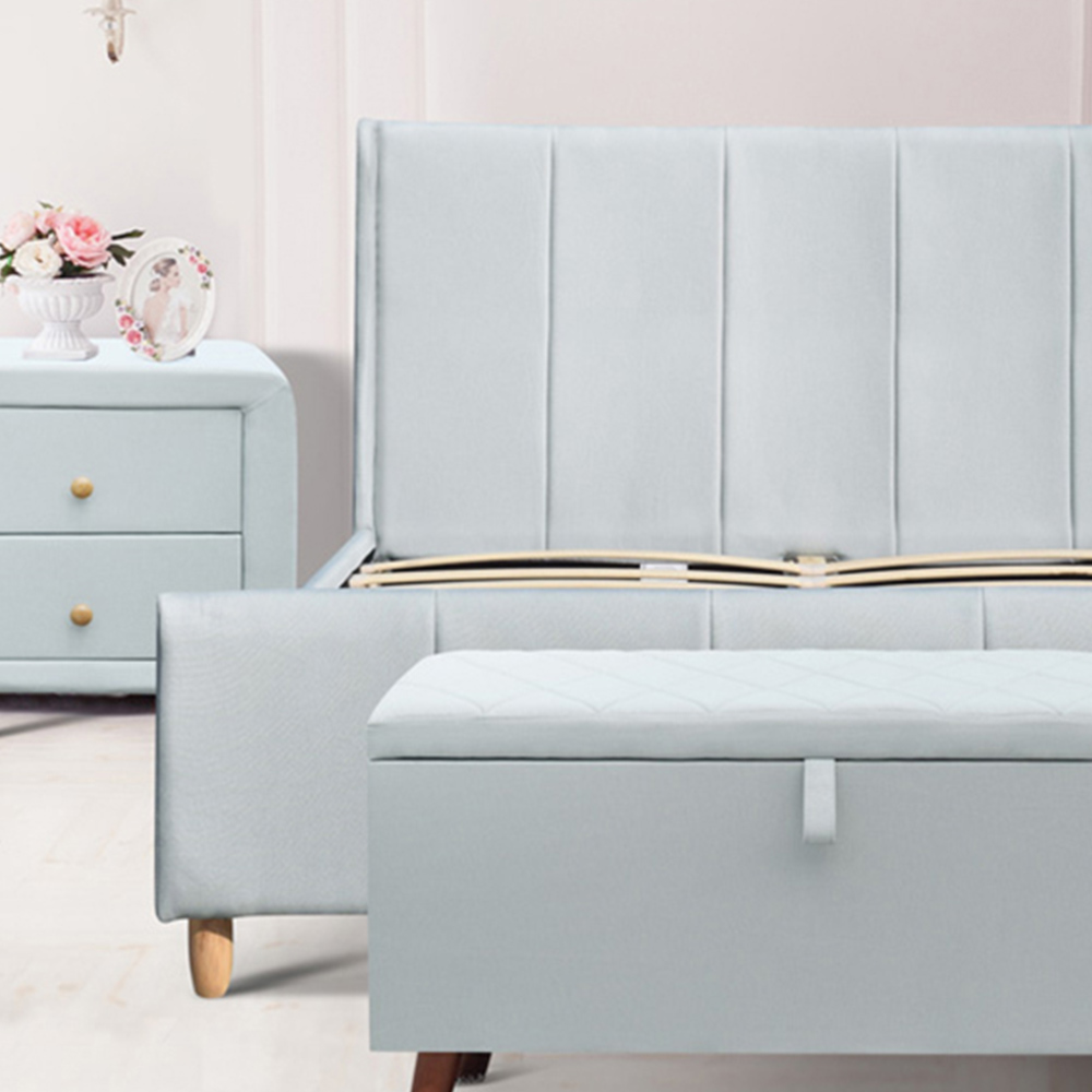 Sink into serenity with the Brooklyn king-size bed frame. Beautifully upholstered in a calming blue linen fabric, this bed features a deeply padded headboard and footboard, creating a haven of comfort. Crafted with a solid wooden frame and a sprung slatted base, it provides exceptional support for your mattress, ensuring a restful night's sleep. To complete the look, two matching bedside tables, upholstered in the same luxurious linen, are included.