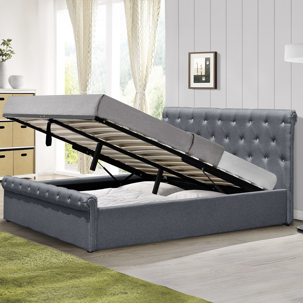 The Brooklyn Chesterfield king-size ottoman bed frame will bring a touch of elegance to your bedroom decor. Upholstered in sleek grey linen and crafted from solid wood, this bed features a stylish scroll headboard and footboard, complete with diamante detailing. The bed comes with a sprung slatted base to support the mattress. Lift the base with its gas lift mechanism to reveal ample straight-to-floor storage space, perfect for stowing away your belongings with ease.