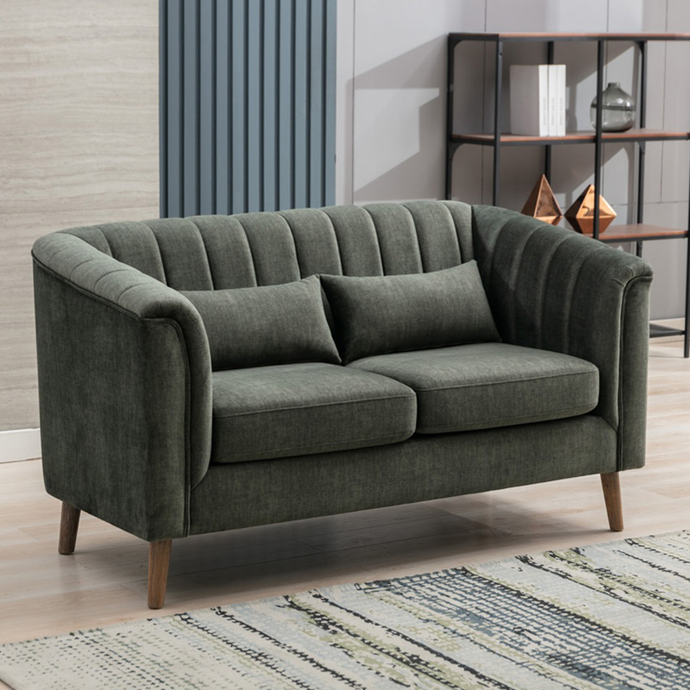 Cosy fabric meets contemporary design in this sofa. Detailed lines accent the modern back, complemented by sturdy wooden feet. Relaxe and unwind with the included scatter cushions.