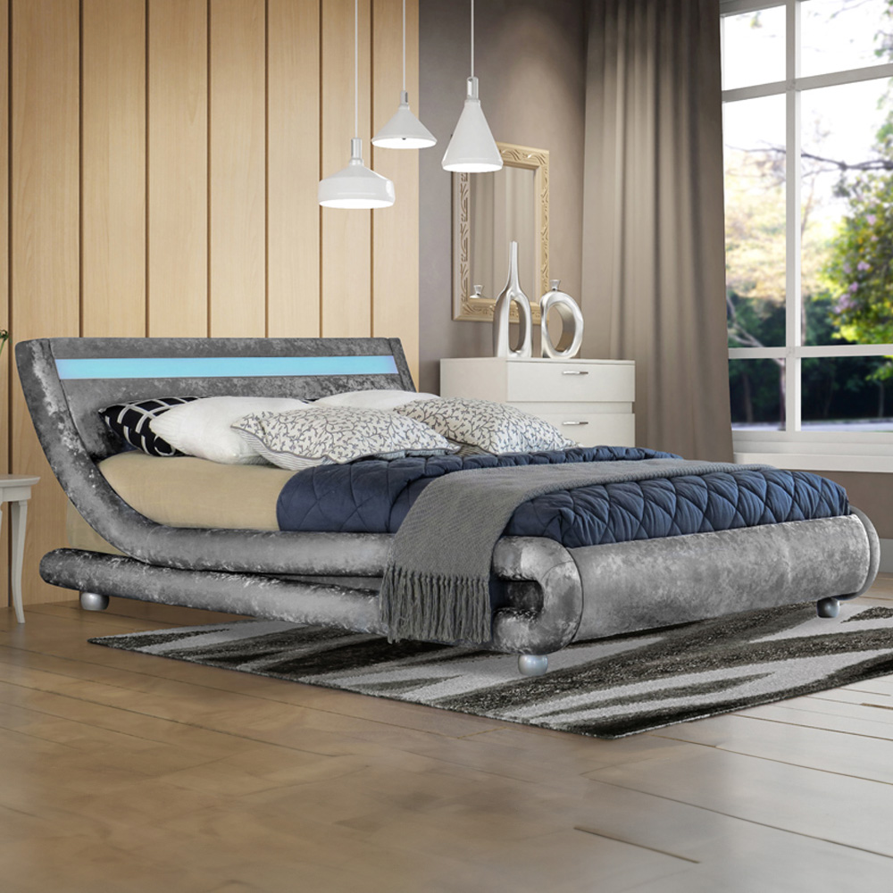 Brooklyn Modern Curved Double Silver Crushed Velvet Bed Frame with LED