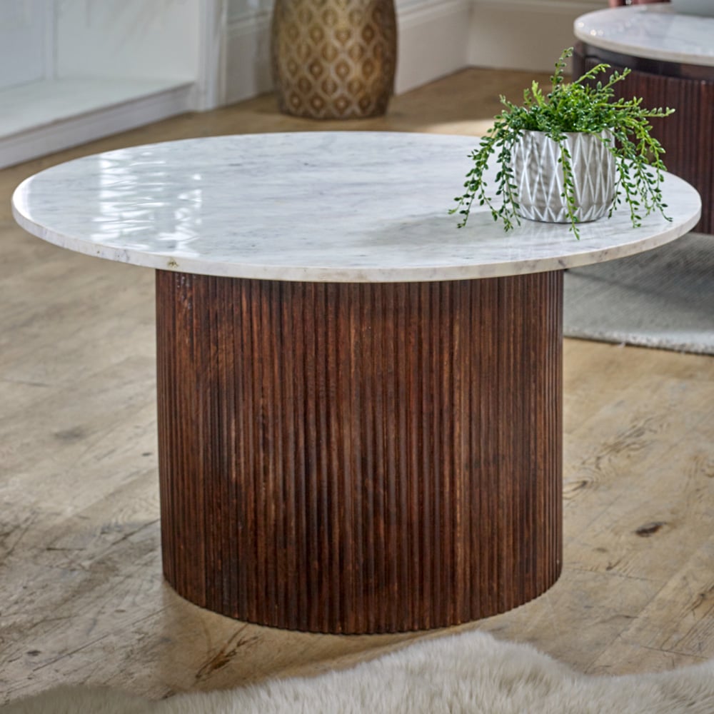 A striking statement piece for any home, this coffee table showcases the beauty of natural marble complemented by a fluted wooden surround. Handcrafted with care by skilled artisans in India, its chunky design is both stylish and eco-conscious, constructed from 100% mango wood and natural marble. Note this particular design does not feature drawers.