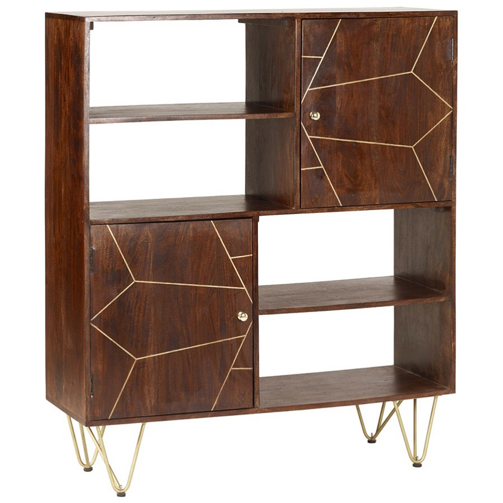 Bring a touch of modern artistry to your home with this unique furniture design. Solid wood construction meets abstract metal inlays, taking craftsmanship to the next level. The angled metal legs complete the retro-vintage aesthetic.