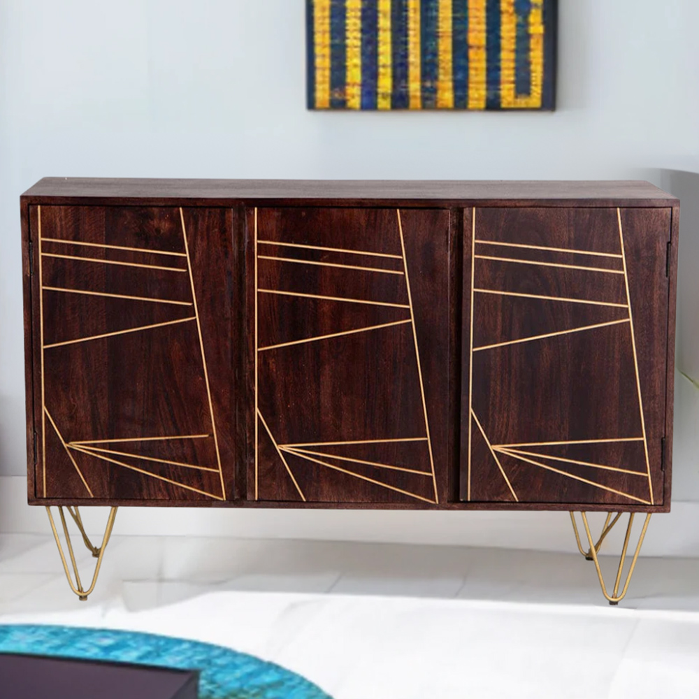 Elevate your living space with this modern furniture design, where solid wood meets metal inlays to form an eye-catching abstract pattern. The piece represents a new echelon of furniture craftsmanship. Angled metal legs complete the look, enhancing its retro-vintage aesthetic.