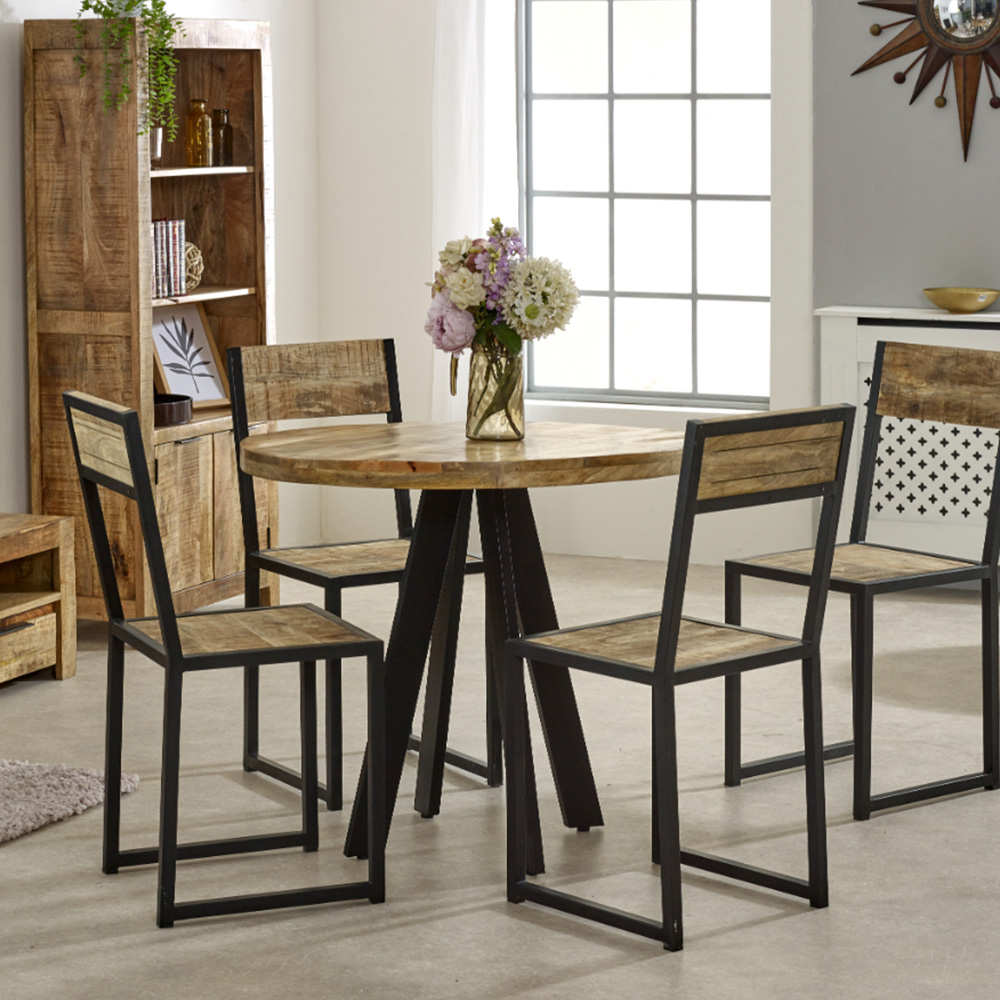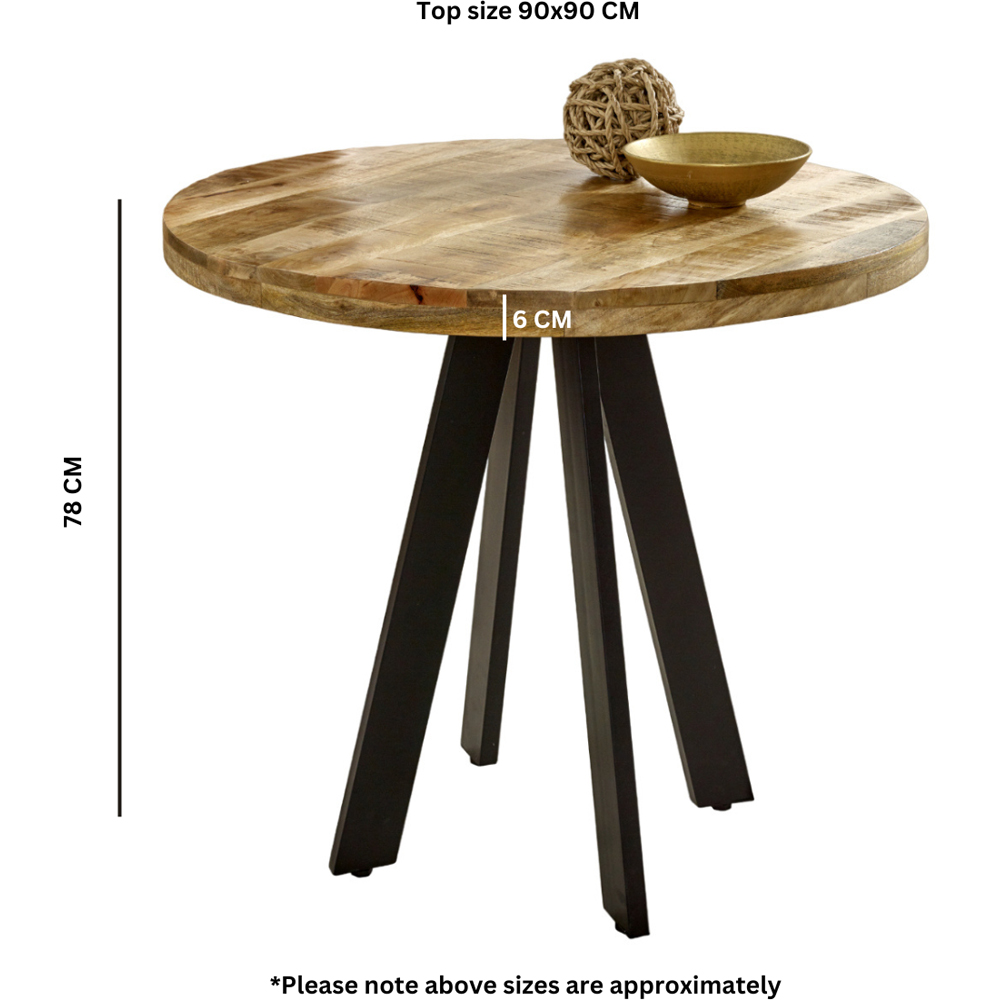 Crafted by skilled artisans in India from 100% eco-sourced solid natural wood, this four-seater round dining table offers a unique blend of rustic charm and modern design. The rough-sawn lacquered finish on the tabletop accentuates the wood's inherent beauty, providing a distinctive, handmade aesthetic. Supported by striking spider metal legs, this table is equally suited for entertaining dinner guests or enjoying everyday family meals.