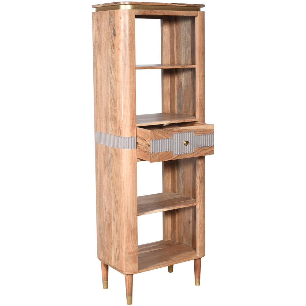 With its clean lines and natural beauty, this bookcase, crafted from premium acacia wood with a sleek lacquered finish, will enhance any living space. Open shelves provide the perfect platform to display books, trinkets, and photos, whilst a convenient drawer offers discreet storage for anything you'd prefer to keep out of sight. Standing at 60cm wide, 40cm deep, and 175cm high, this bookcase offers spaciousness and practicality. The warmth and organic charm of the acacia wood adds a touch of character to your home, and the protective lacquer adds a subtle sheen.