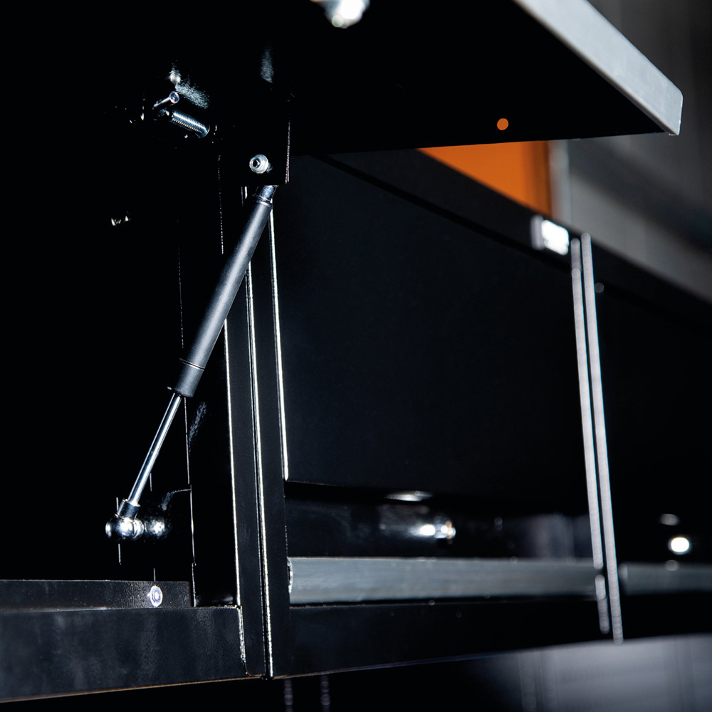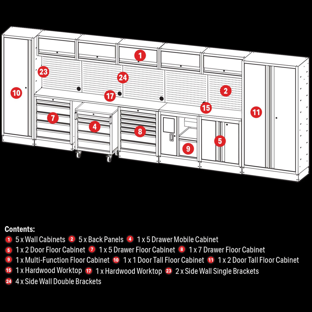 Transform your garage or workshop with the Bunker 25-Piece Modular Storage System. This stunning combo creates the ultimate indoor workspace. Built from premium steel with a durable matt black powder-coated finish, it's designed for lasting performance. The floor cabinets offer incredibly versatile storage, boasting large cupboard spaces with fully adjustable shelves and smooth soft-close drawers lined with protective foam. A hardwood worktop provides a functional workspace, complete with an integrated rubbish bin and paper towel roll holder. A mobile cabinet with five drawers adds extra convenience. Adjustable feet ensure optimal positioning on uneven floors. Wall cabinets feature lift-up doors with whisper-quiet gas struts, and the back panels double as pegboards, each with a pre-cut power access hole. Each unit includes an integral lock with two keys for security. Simple installation is ensured with all required fittings included. A 10-year warranty guarantees quality. Plus, receive a free magnet with a distinctive logo. Size: H2000 x W4915 x D463mm. Please note: Delivery requires scheduling due to careful packing and product weight, two people are recommended for lifting. Contents: 1 x Modular five-drawer mobile cabinet (646mm), 1 x Modular two-door floor cabinet (680mm), 1 x Modular five-drawer floor cabinet (680mm), 1 x Modular seven-drawer floor cabinet (680mm), 1 x Modular multi-function floor cabinet (680mm), 5 x Modular wall cabinets (680mm), 1 x Modular two-door tall floor cabinet (915mm), 1 x Modular one-door tall floor cabinet (600mm), 1 x Modular hardwood worktop (680mm), 1 x Modular hardwood worktop (2040mm), 5 x Modular back panels (602mm), 2 x Modular side wall single brackets, 4 x Modular side wall double brackets.