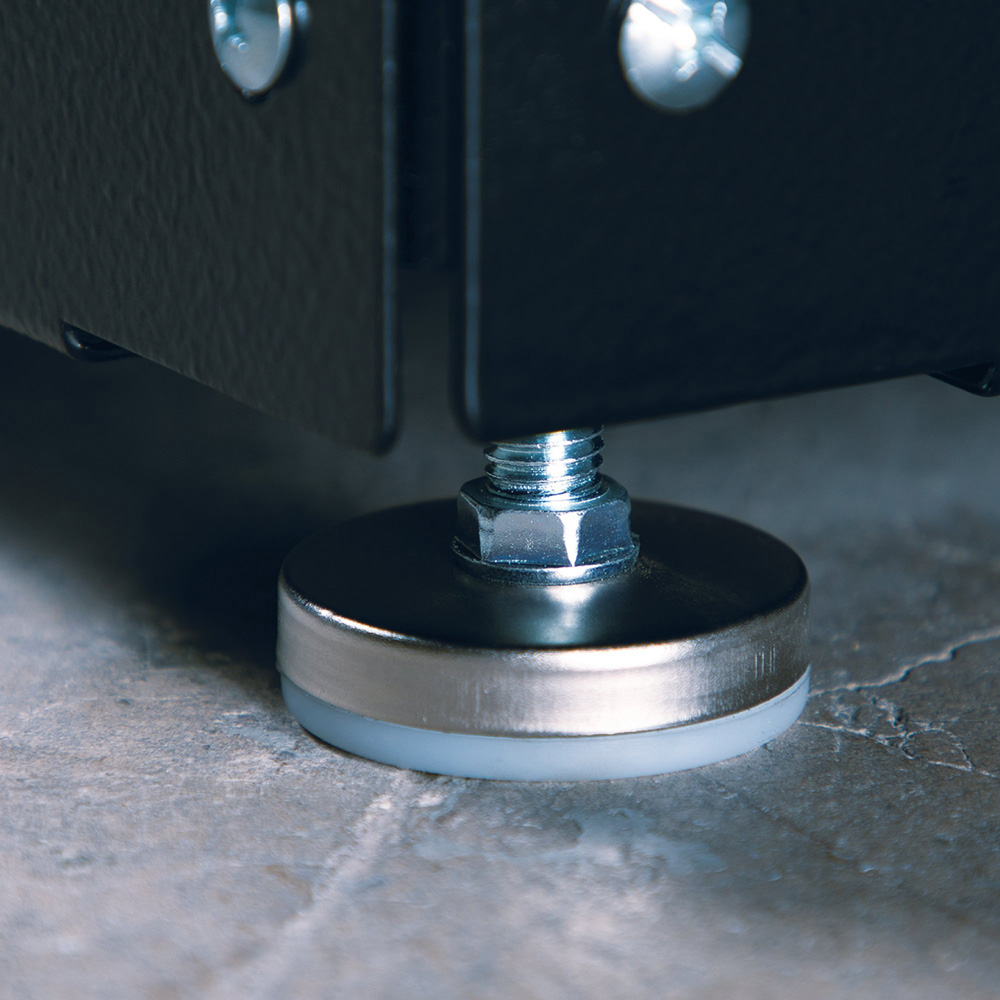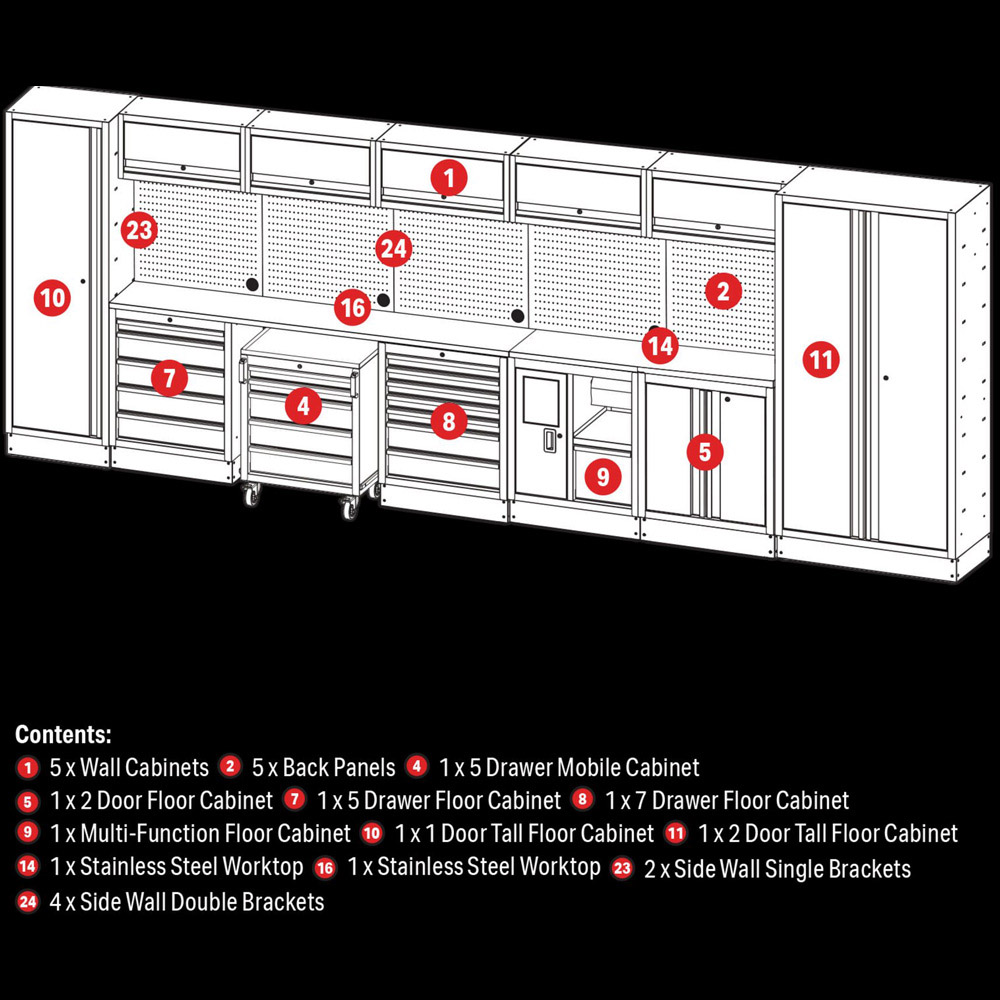Transform your garage or workshop with the Bunker 25-Piece Modular Storage System. This stunning combo features a durable, matt black textured industrial powder-coated steel construction for lasting performance. The system boasts incredibly versatile storage with large cupboard spaces, fully adjustable shelves, and smooth soft-close drawers lined with protective foam. A functional workspace is created with steel worktops, an integrated rubbish bin, and a paper towel roll holder. The mobile cabinet adds five extra drawers for ultimate organisation. Adjustable feet ensure optimal positioning, while lift-up wall cabinets with whisper-quiet gas struts provide easy access. Back panels double as pegboards, each with a pre-cut power access hole. Integral locks with two keys included provide security. Simple installation is ensured with all required fittings included. A 10-year warranty provides peace of mind. Includes a free magnet with a distinctive logo. Size: H2000 x W4915 x D463mm. Please note: Delivery requires scheduling due to careful packing and product weight, two people are recommended for lifting. Contents: 1 x Modular five-drawer mobile cabinet (646mm), 1 x Modular two-door floor cabinet (680mm), 1 x Modular five-drawer floor cabinet (680mm), 1 x Modular seven-drawer floor cabinet (680mm), 1 x Modular multi-function floor cabinet (680mm), 5 x Modular wall cabinets (680mm), 1 x Modular two-door tall floor cabinet (915mm), 1 x Modular one-door tall floor cabinet (600mm), 1 x Modular stainless steel worktop (680mm), 1 x Modular stainless steel worktop (2040mm), 5 x Modular back panels (602mm), 2 x Modular side wall single brackets, 4 x Modular side wall double brackets.