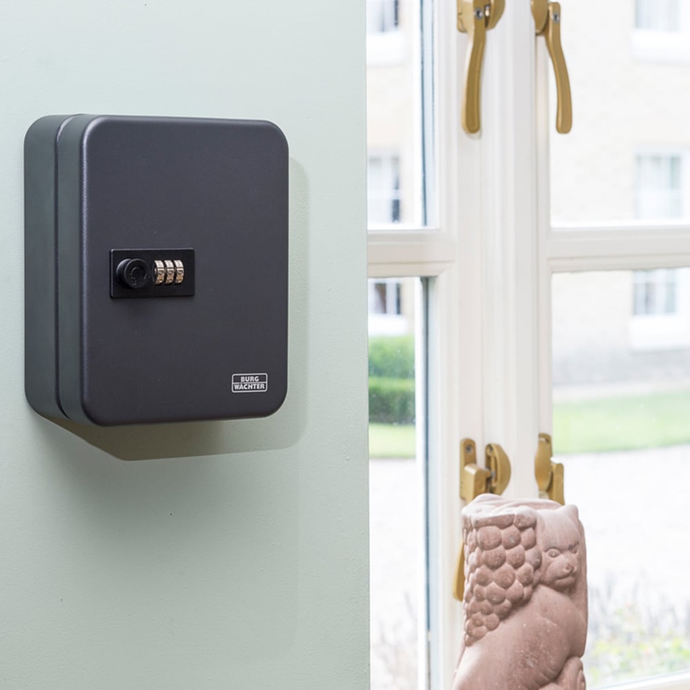 If you're still hiding your spare keys under a plant pot, it's time for a more secure solution. The Burg-Wachter 20 Key Combination Key Box provides secure and organised key storage, and can be easily mounted on the wall. With a robust, resettable three-dial combination lock, your keys are kept safe and secure. This key box has a capacity for up to 20 keys, and includes coloured key tags for each, allowing for easy identification and selection via the indexing system. Constructed from strong steel and finished in a stylish matt black, this key box offers both durability and a sleek design, making it ideal for use in the home or office.