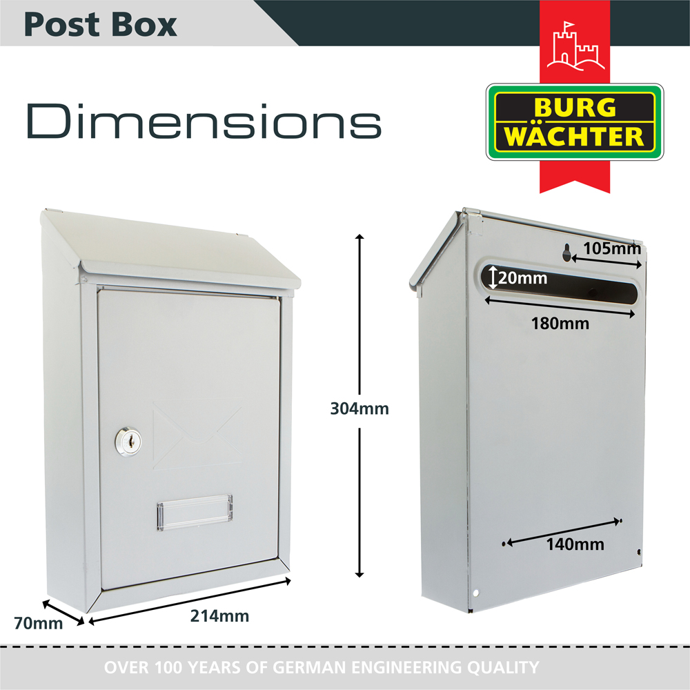 Enhance your space's functionality with the Burg-Wachter Avon Galvanised Steel Silver Post Box. Perfect for mail or suggestions, its dual access—top opening and rear slot—allows versatile mounting behind gates, walls, or standard wall installations. This compact box accommodates envelopes up to A5 size. Built for durability, its corrosion-resistant, powder-coated galvanised steel construction with a tough epoxy powder paint coating ensures lasting performance.