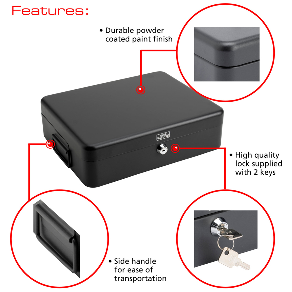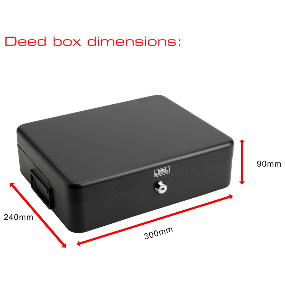 Secure your important documents with this robust 12-inch Burg-Wächter Deed Box. Crafted from strong steel, this lockable box comfortably accommodates A4 papers. Conveniently carry it using the integrated side handle.