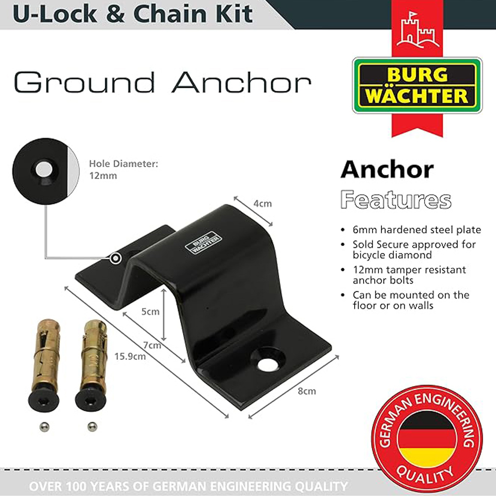 Keep your bicycle or motorbike secure with this Burg-Wächter Sold Secure U-Lock, Anchor, and Motorbike Chain Kit. Ideal for safeguarding your bike at home or while you're out and about. The 1m x 12mm chain is constructed from case-hardened steel, offering robust resistance against hacksaws and bolt croppers. The Gold 100D U-lock features a hardened steel body and a 16mm case-hardened steel shackle for superior protection against attacks. The shackle is further fortified by a double-bolted disc mechanism, locking both ends securely. Additionally, the ground anchor is made from hardened steel and comes complete with tamper-proof floor fixings for added security.