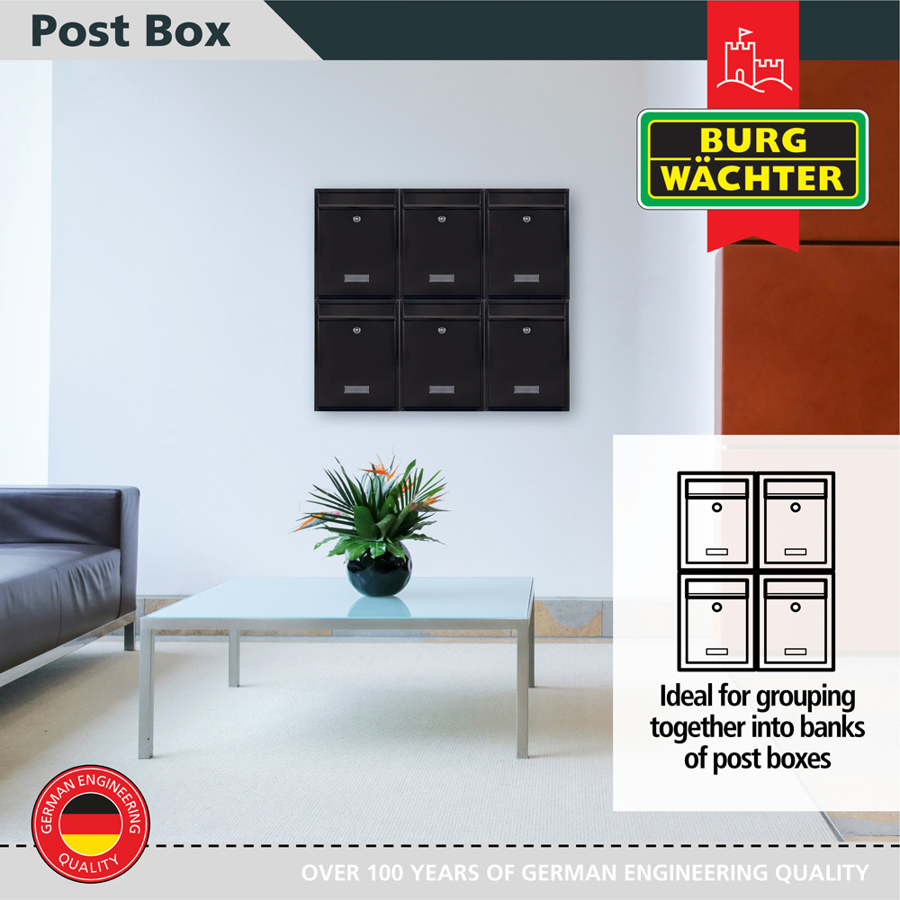 Crafted from robust, galvanised steel, the Burg-Wachter Trent Green Post Box offers a dependable solution for managing your daily mail. Perfectly suited for smaller volumes of post, this postbox is also designed for easy grouping, allowing you to create convenient banks of post boxes. Its outwards-opening letter flap delivers comprehensive weather protection, ensuring your correspondence remains dry, while a carefully considered narrow slot enhances security and deters unwanted removal of items. Mail is retrieved by unlocking the drop-front door, secured by a reliable lock. This post box represents a practical and durable addition to any property.