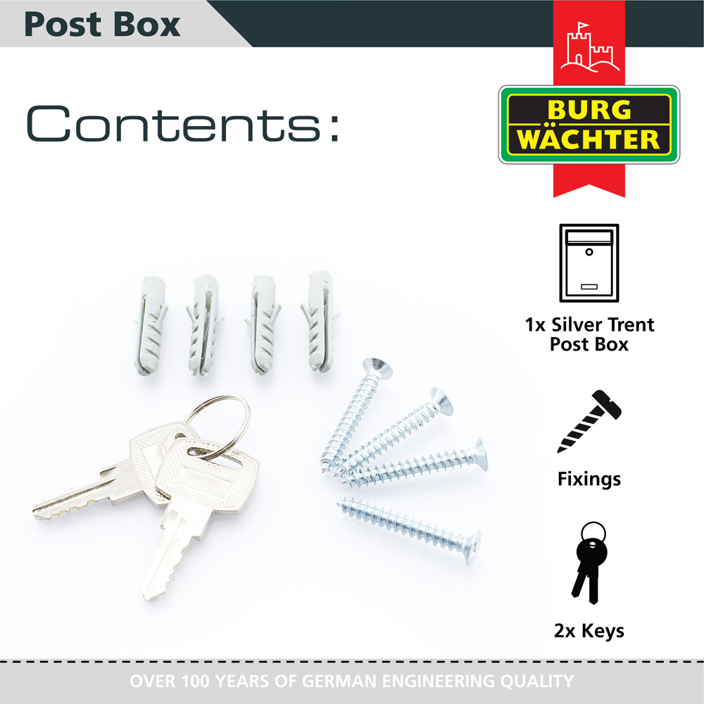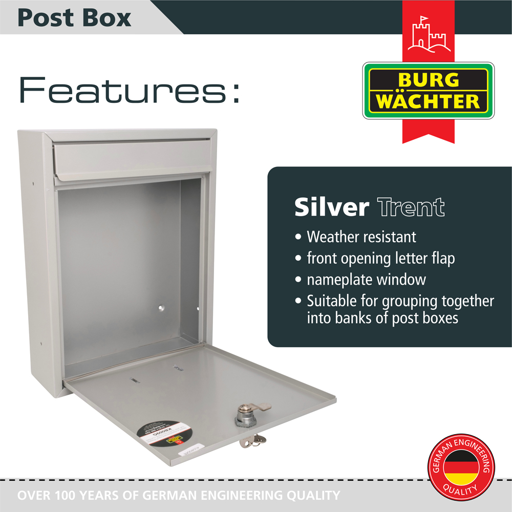 Crafted from robust galvanised steel, the Burg-Wachter Trent Silver Post Box features a secure lock, ideal for smaller mail volumes. Perfect for creating grouped post box arrangements, this letterbox includes an outwards-opening letter flap providing comprehensive weather protection to keep your post dry. The specially designed narrow post slot offers enhanced security against mail theft. Retrieval is simple, via the lockable, drop-front door.