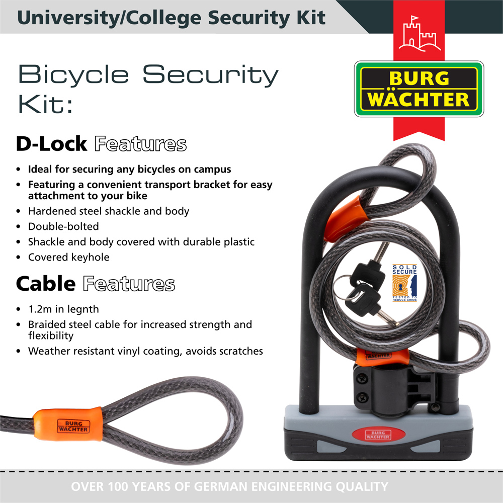 The Burg-Wachter University Security Kit offers students comprehensive protection for their valuables, both at home and on campus. This kit includes a Heinz SafeCan for concealing small items, a secure cash box with two keys, and two combination padlocks for convenient, keyless access to bags and lockers. Bicycle security is ensured with a durable D-lock, boasting a hardened steel shackle and a 1.2-meter cable, ideal for securing your bike during lectures and transit. This all-in-one security solution provides peace of mind against theft.