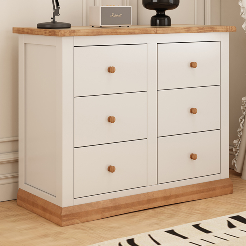 Looking for a charming storage solution? The Trevi chest, crafted with care from responsibly sourced solid pine wood and veneers, offers a delightful country aesthetic. The body features a hand-finished, eco-friendly, water-based off-white lacquer, complemented by a hand-waxed top. This chest boasts five equally sized drawers, providing ample space for pants, folded clothes, gym wear, bedding or towels to keep your home organised. The sturdy 3cm thick solid wood framed top is ideal for displaying cherished photos or a coordinating mirror. Designed for simple home assembly, this chest combines practicality and value, ready to enhance your home today. A useful five drawer chest for the bedroom or elsewhere in the home.
