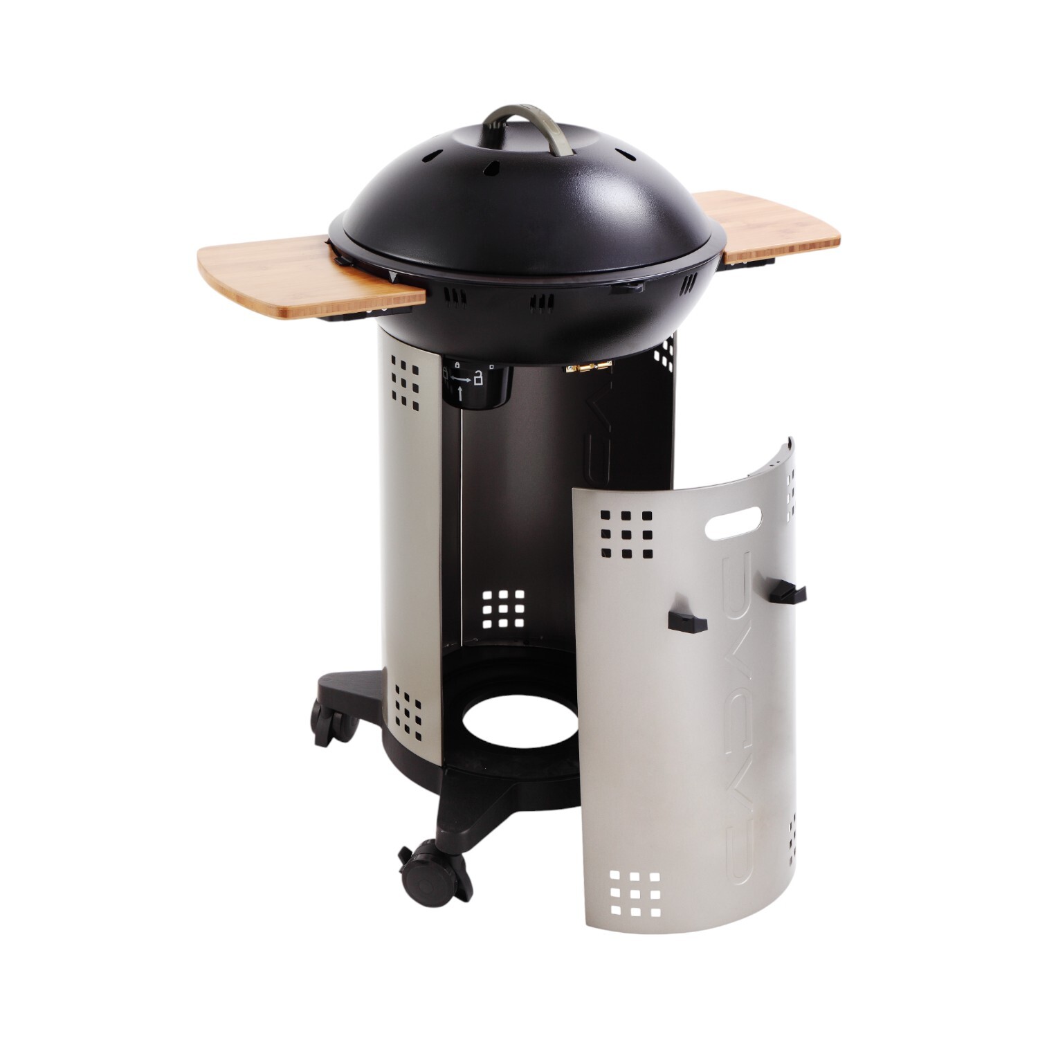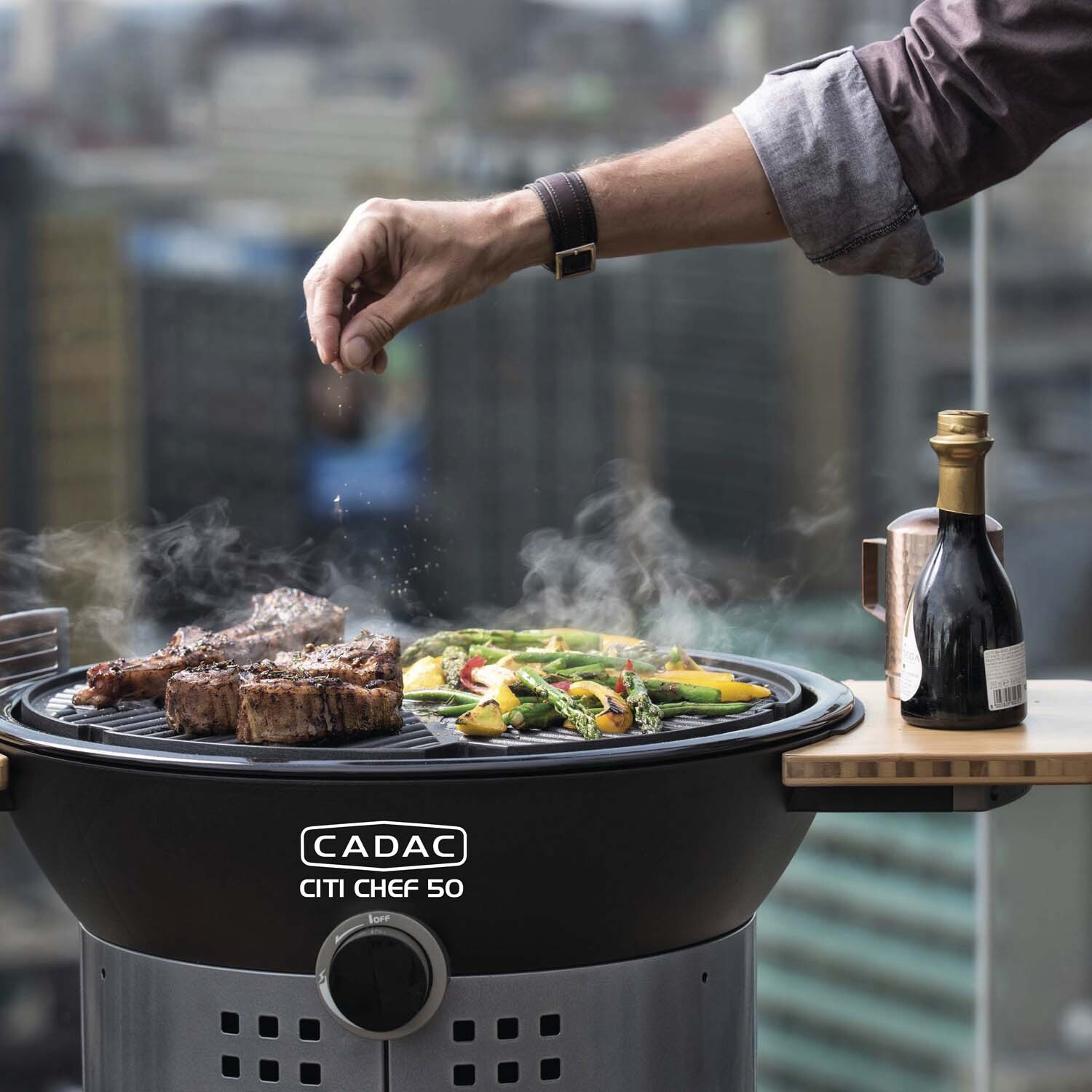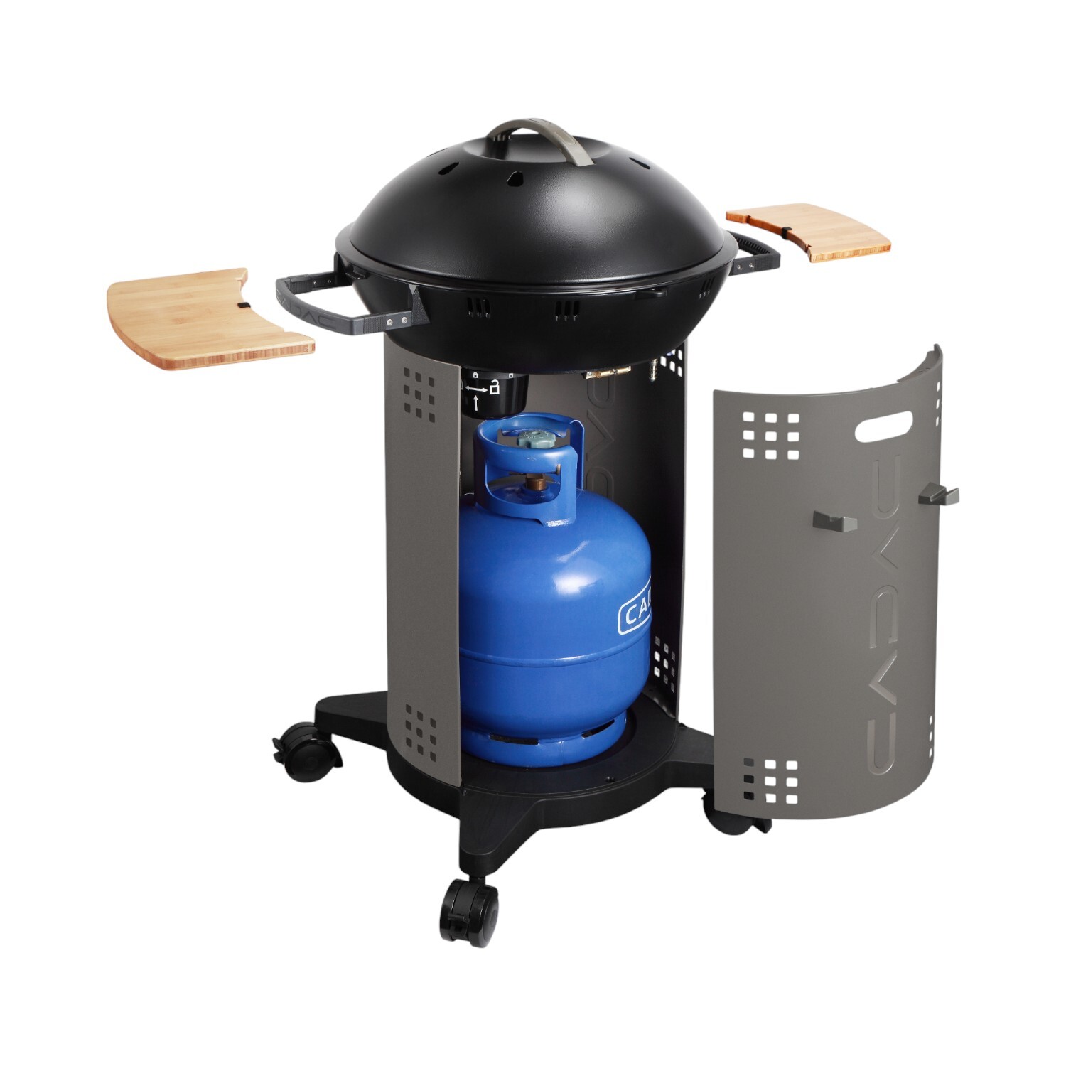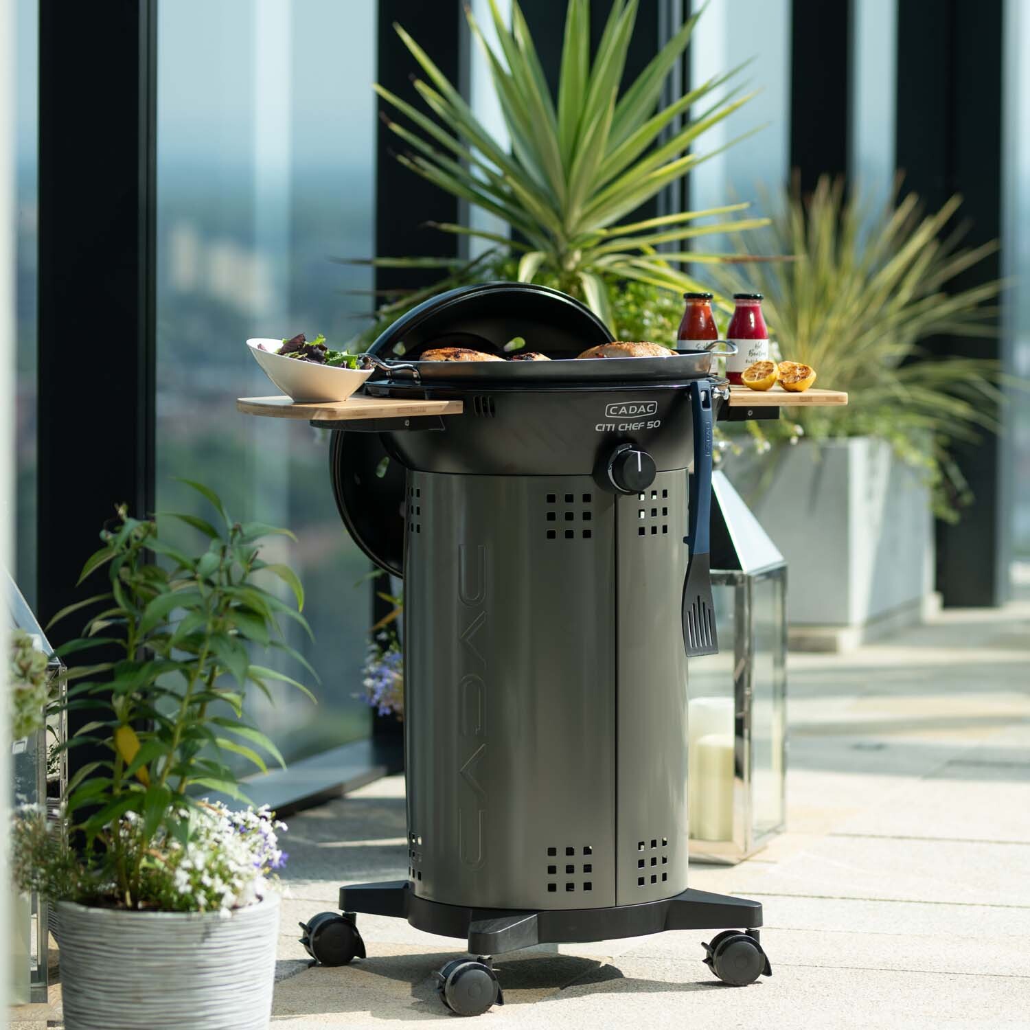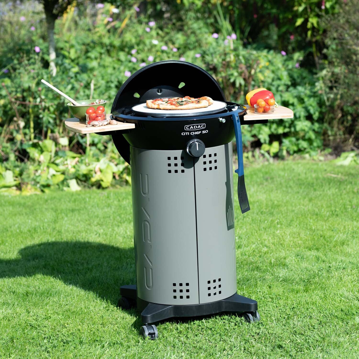 Maximise your outdoor cooking with the Cadac Citi Chef 50 Black and Grey Gas BBQ, perfect for small spaces like balconies and patios. Its compact design allows you to grill, barbecue, bake, or roast with ease. It features a dome lid with a thermometer, a ceramic BBQ grid, automatic piezo ignition, and finely adjustable temperature control. The BBQ comes with a 47cm ceramic-coated grill, a pot stand, and a protective cover, ensuring you're always ready to create delicious meals. Stylish bamboo side tables can be attached or removed for easy storage, and the grill hides a gas cylinder for a neat look. Cleaning up is simple, thanks to a special fat pan and a hidden fat cup that collects any drippings. With a powerful burner and precise temperature control, the Citi Chef 50 is ideal for urban living.