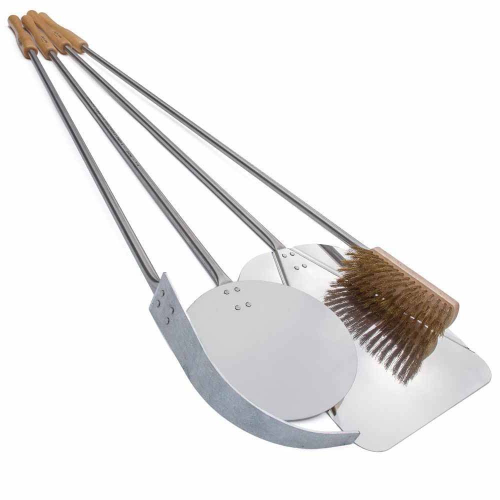 This four-piece pizza oven toolset will complete your outdoor cooking experience. Effortlessly manage your outdoor oven with a 30cm blade pizza peel, a round peel for turning pizzas, a long log hook to easily adjust the fire, and a brass bristle brush to keep your oven floor clean. Each tool features a long stainless steel handle with a comfortable wooden grip, ensuring ease of use and comfort. Perfect for both novice and seasoned outdoor cooks.