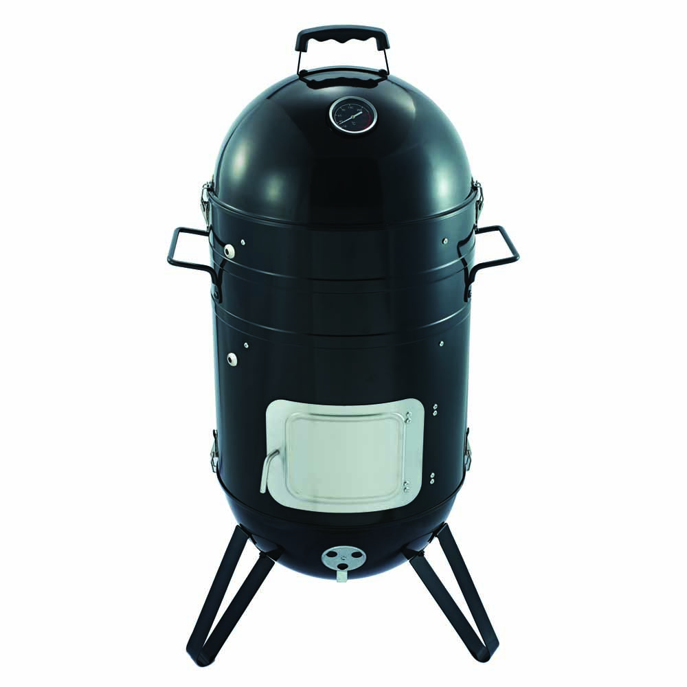 This Callow Vertical BBQ Smoker Grill is perfect for creating delicious barbeque feasts. Made from durable 0.9mm steel, it offers excellent heat control and retention. Four base vents and two lid vents allow for precise temperature adjustment, while the fully ventilated charcoal bowl ensures even burning. A reliable temperature gauge is built into the lid. Included are two grill racks, a stainless steel hanging rack with hooks, temperature probe holes at two levels, and an access door. Secure stainless steel clips keep everything together. A free cover and full assembly instructions are provided. Enjoy 5-6 hours of cooking time. The product diameter is 14 inches. Protect your investment with our premium BBQ covers.