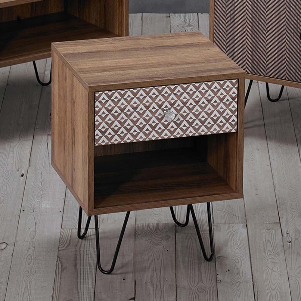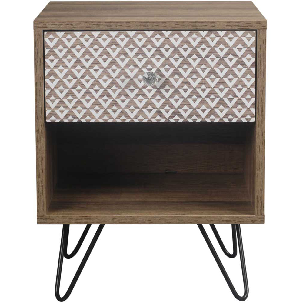 Elevate your bedroom with the Casablanca single drawer bedside table – a stylish blend of traditional and contemporary design. Its wood-effect finish, achieved through foils and prints, offers a quirky take on a classic piece, adding depth and texture to your space. The single drawer and open shelf provide convenient storage, while the black wired legs lend an industrial edge. Crafted from particleboard, this charming table is the perfect perch for a lamp or your phone, seamlessly complementing any interior.
