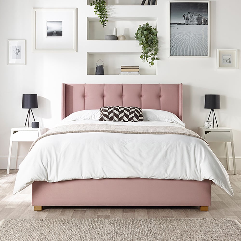 Elevate your bedroom with the Catherine Lansfield Utopia Double Emerald Ottoman Wing Bed. This stylish bed boasts a luxurious brushed velvet upholstery, creating a sophisticated feel. The winged headboard, deeply padded and featuring a buttoned vertical design, adds a touch of timeless elegance. But style isn',t everything, this ottoman bed also offers generous storage, easily accessible via gas lift pistons for hands-free operation. The robust mechanism securely holds the base open for convenient access, and comfortably supports mattresses weighing up to 60kg. Ensuring lasting comfort, the bed features a quality sprung slatted base. Please note: the storage area is unboarded but includes a dust sheet for protection. Self-assembly is required, allow approximately one to two hours.