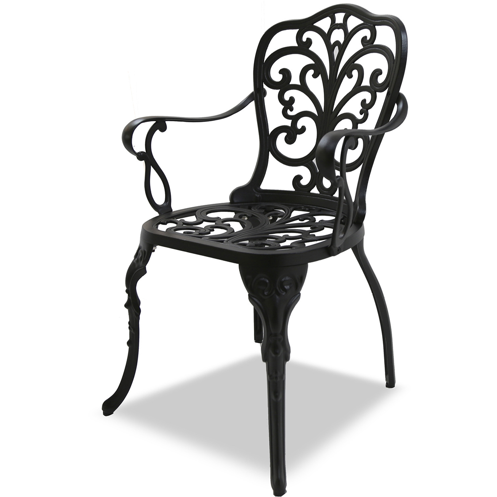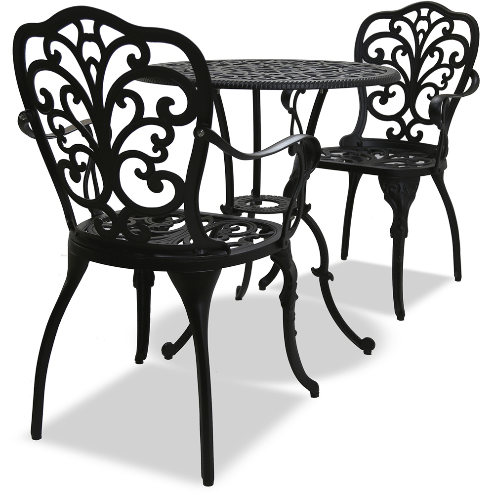 Maximise your space with the lavishly designed Bangui bistro set, a practical and convenient addition to any setting. Perfect for gardens, patios, terraces, decking, balconies, lawns, or yards, this 3-piece set adds a touch of elegance wherever it sits. The Bangui features two high-backed, large chairs with armrests and a matching table, showcasing a Spanish-influenced design with intricately patterned chairs, a detailed floral tabletop, and stylish legs.