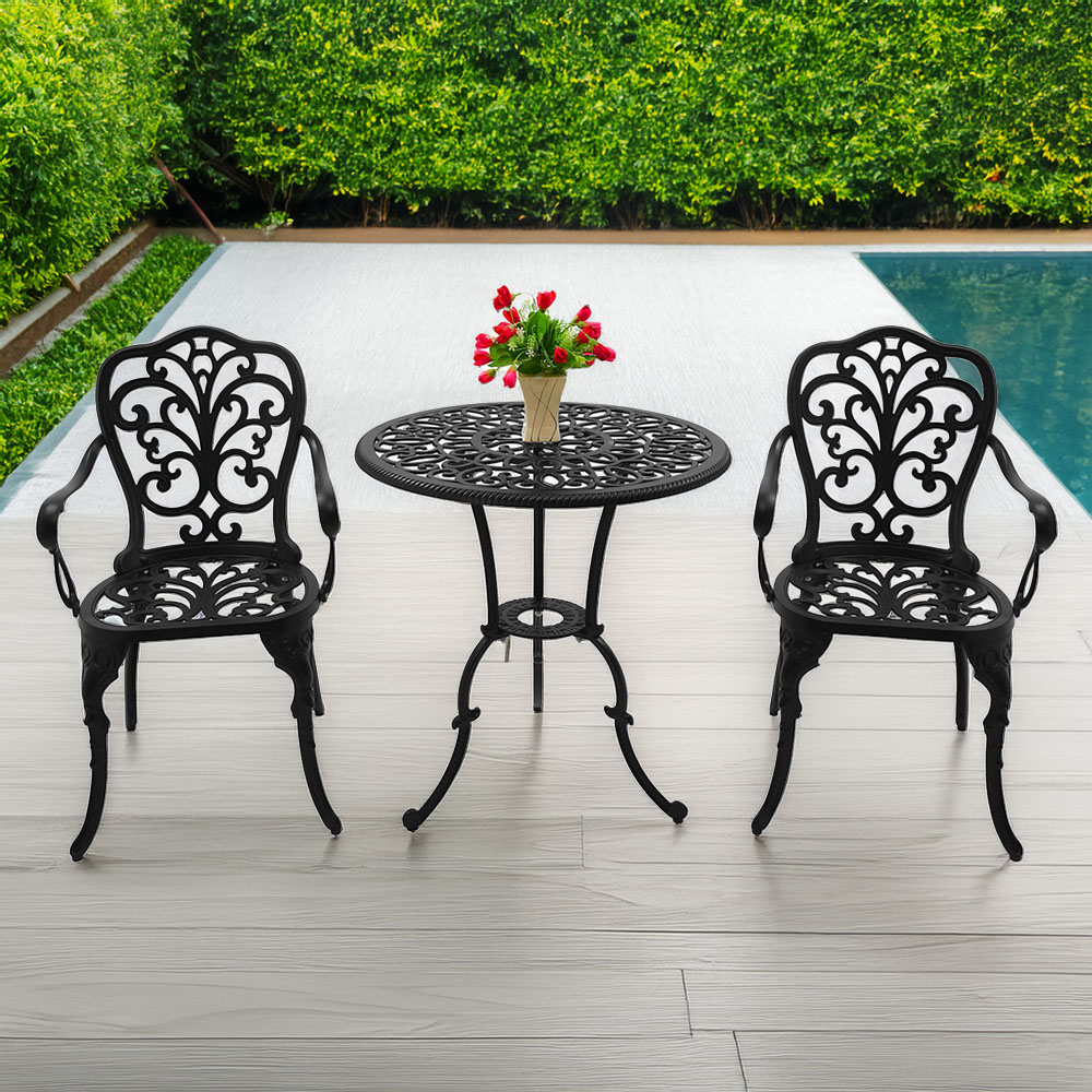 Designed for durability, the Bangui cast aluminium bistro set is crafted to withstand the elements year-round, resisting most types of extreme weather. Its long lifespan means it won't need replacing every few years like wood, plastic, and other materials; it will not rot or rust.