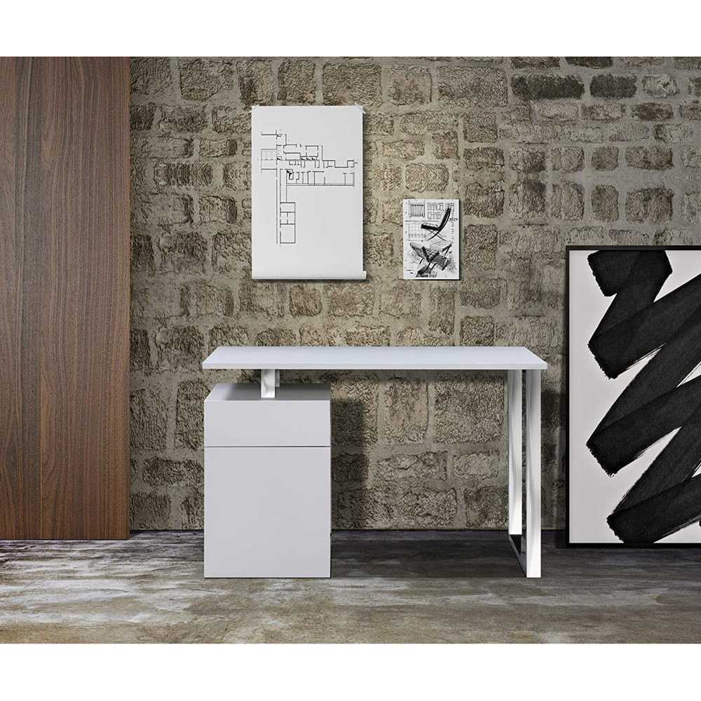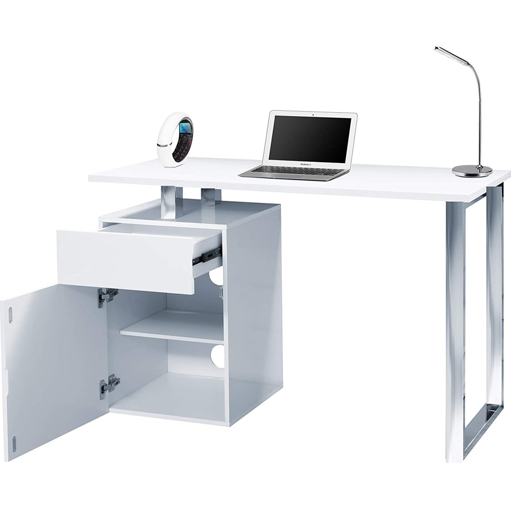 Crafted for the modern home or office, the luxurious Calista multi-purpose computer desk provides a generous work surface suitable for daily use. This home office desk features a smooth, easy-glide pullout drawer, alongside a 2-shelf cabinet with contemporary flush fronts, catering to a variety of storage needs. The sturdy frame and solid build ensure exceptional stability for all your equipment. Supported by stylish U-frame steel legs, this eco-friendly desk is constructed with responsibly sourced materials and finished with parallel edges. Designed without compromise, the ergonomic Calista desk is delivered flat packed, complete with a clear and concise manual for straightforward self-assembly. Easy to clean, this desk's colour is designed to resist fading. Dimensions: Width: 120cm x Depth: 50cm x Height: 77cm.