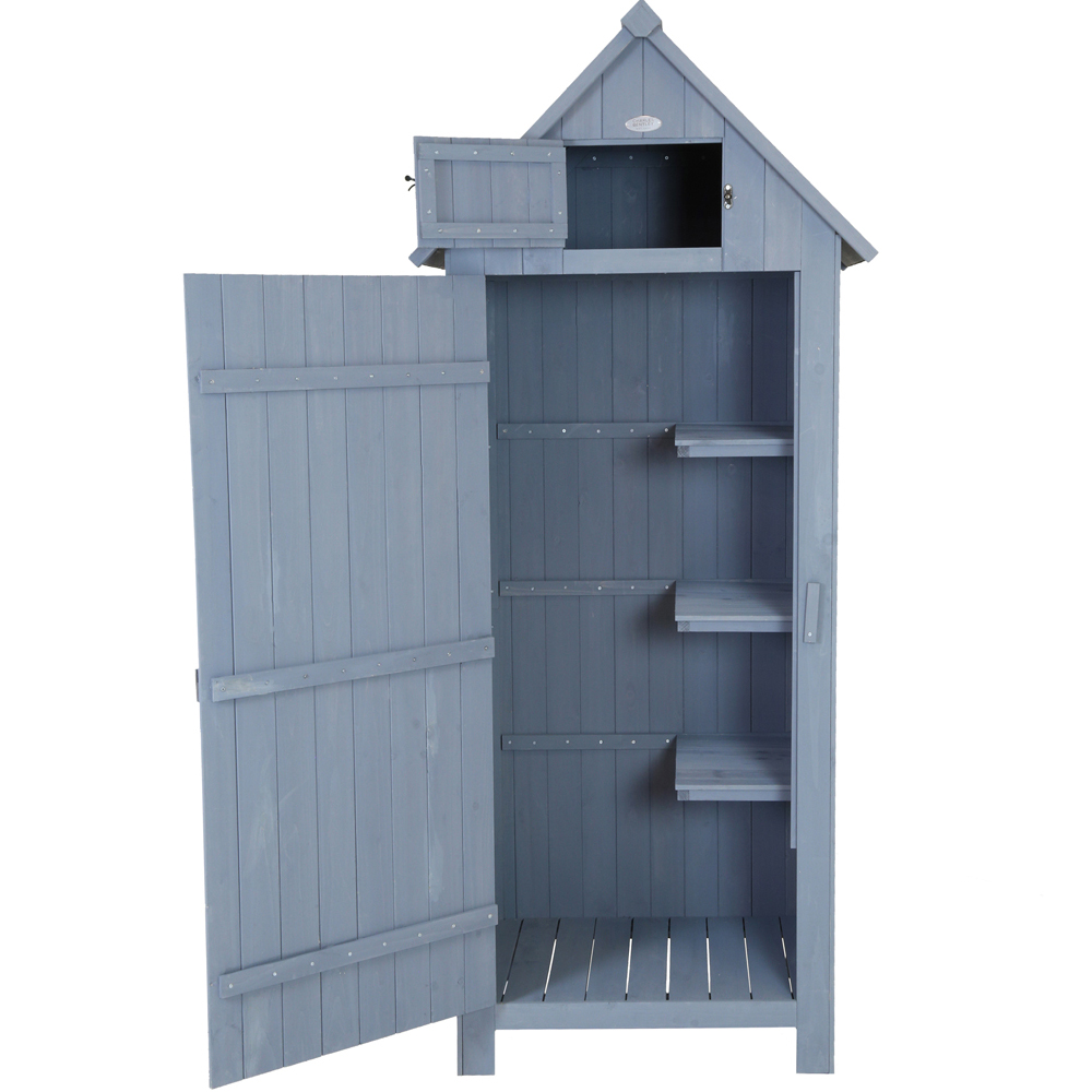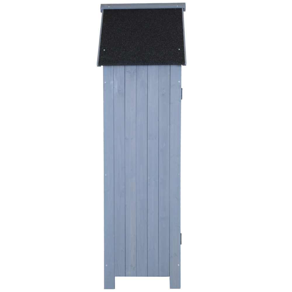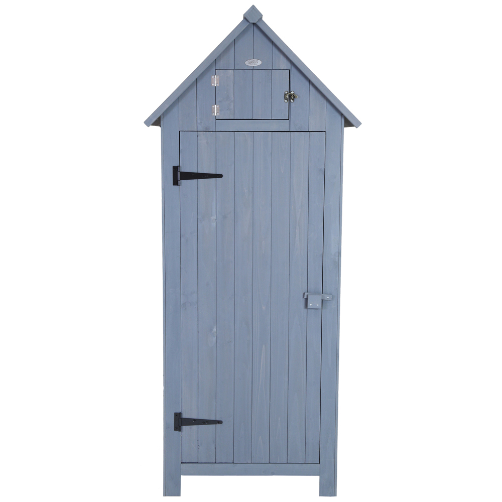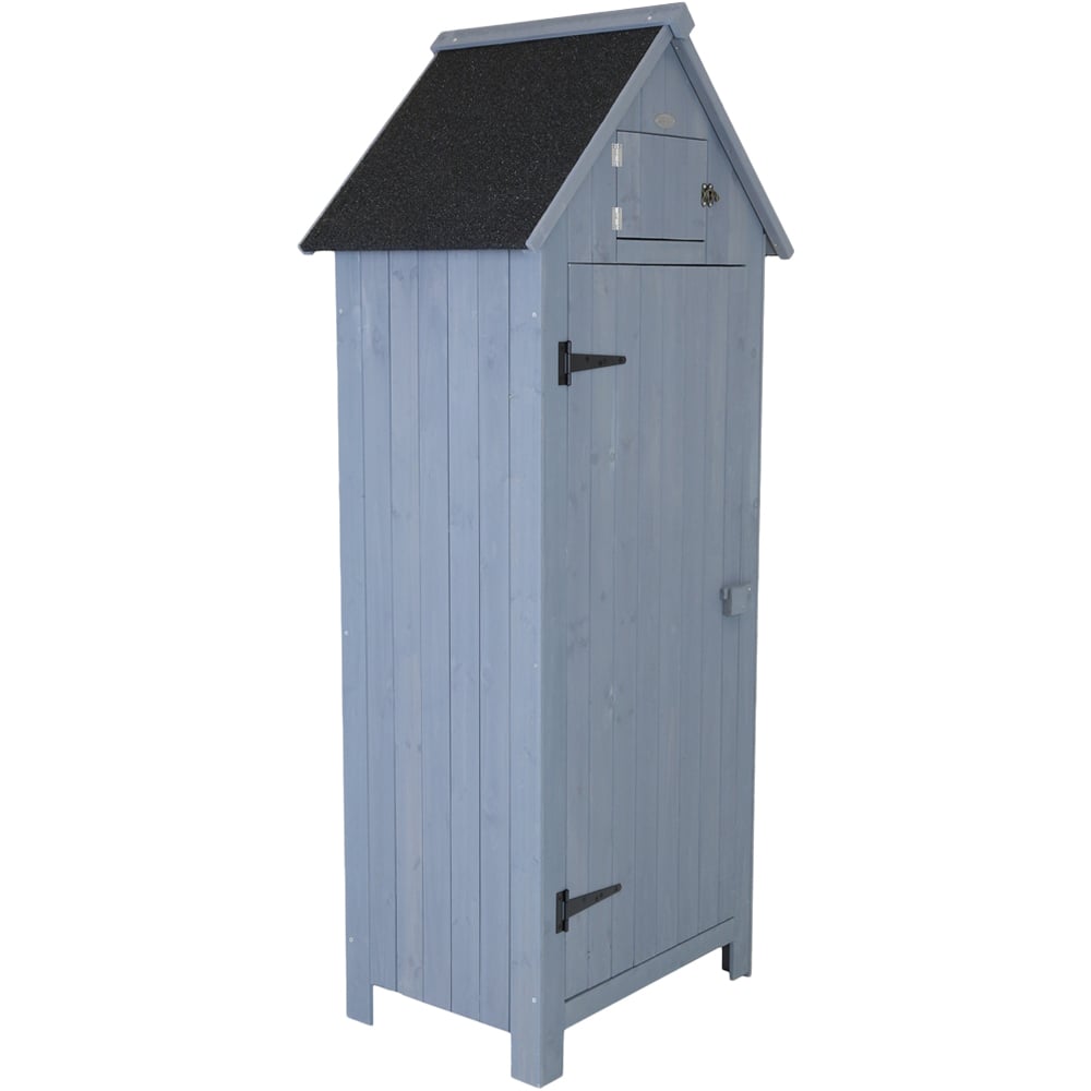 This stylish grey Charles Bentley FSC Slim Tall Garden Storage Shed is a compact alternative to a full-size shed. Its Sentry design blends classic wooden shed aesthetics with a space-saving footprint, perfect for storing garden tools, outdoor furniture, or children's toys. Keep your garden organised and your belongings safe with its 179cm height, accommodating items of varying sizes. Security is ensured by a metal lock on the hutch and a wooden lock on the large door, safeguarding your valuable garden tools and accessories. Three internal shelves and an additional hutch provide ample storage. Assembly is required.