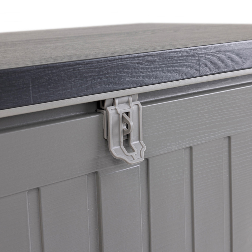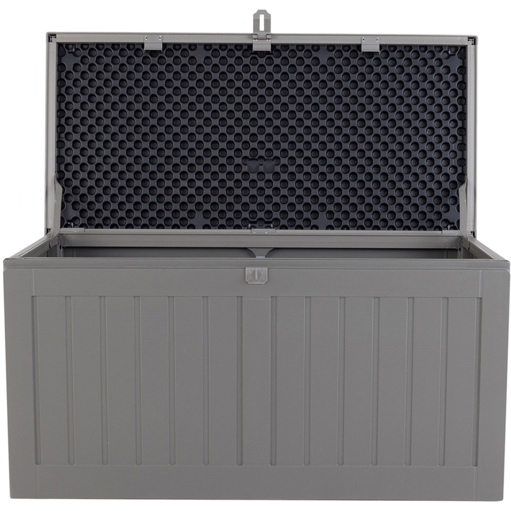 This stylish beige and grey outdoor storage box provides a secure and organised storage solution for your belongings. Boasting a generous 190-litre capacity, it's perfect for storing a wide range of items, both indoors and outdoors. The durable plastic construction includes a PP vacuum and is reinforced with two PP straps for added strength and stability. A padlock hasp offers extra security, keeping your contents safe from the elements and unwanted access. Dimensions: W96 x D45.8 x H49.3cm.
