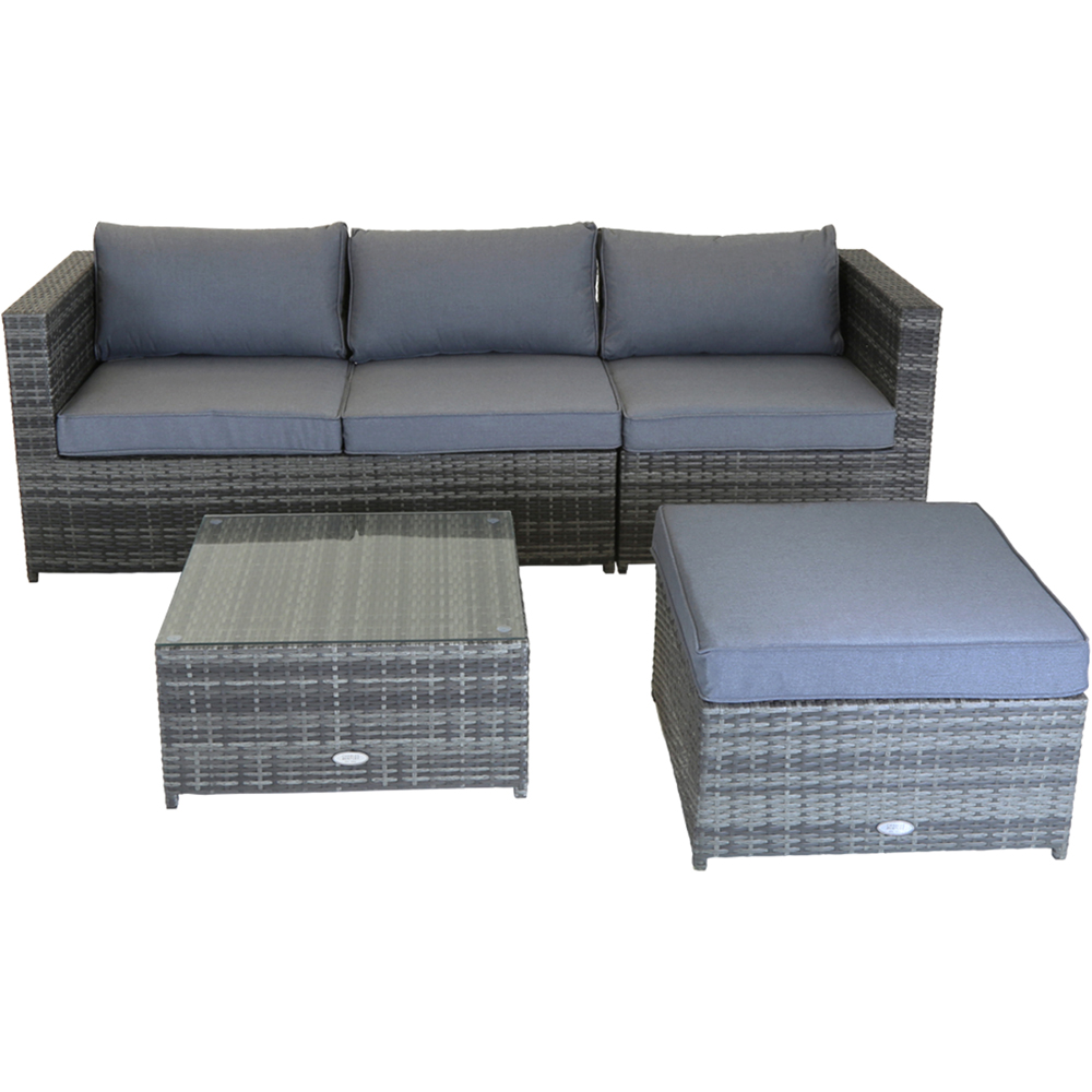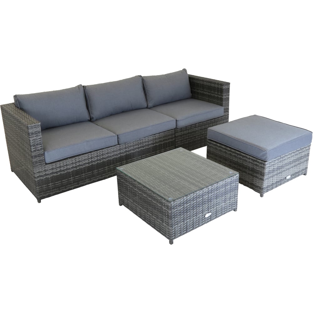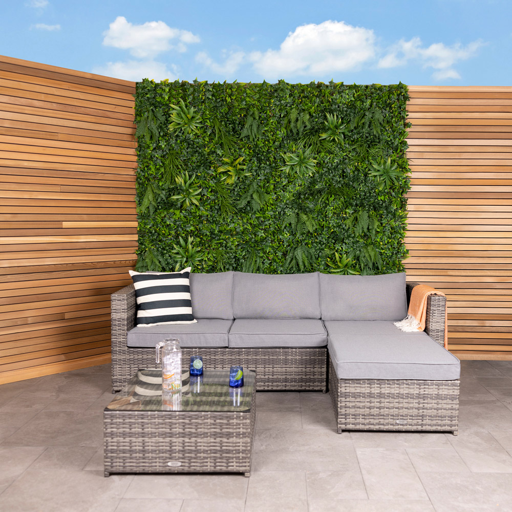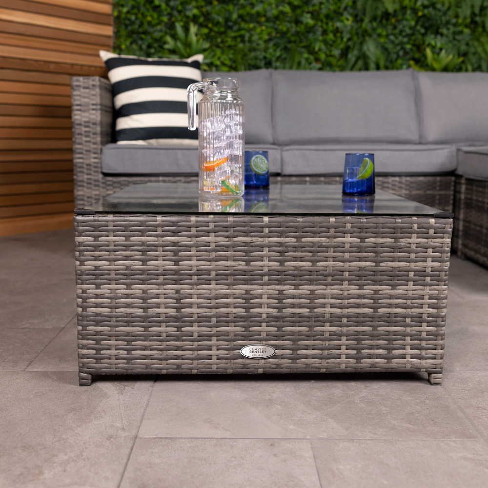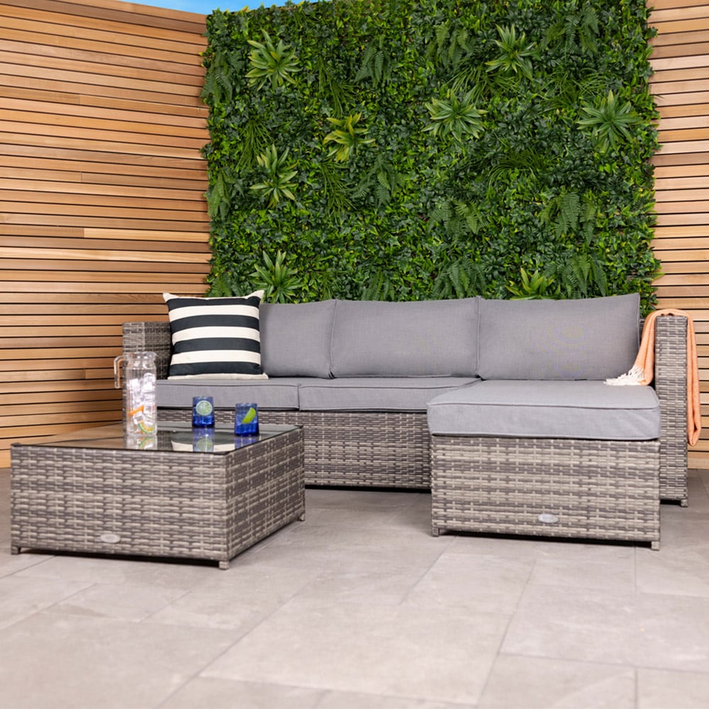 Enjoy ultimate relaxation in your garden with this stylish Charles Bentley L-shaped rattan furniture set. Designed for up to three people, this attractive set includes an L-shaped sofa and a footstool for extra comfort. Made from durable, variegated flat weave rattan, the set boasts grey cushions for added comfort. Dimensions: Corner sofa: H64 x W73 x D73cm, Two-seat size: H64 x W136 x D73cm, Stool: H29 x W63 x D63cm, Tea table: H29.5 x W60 x D60cm, Seat height: 29.5cm, Rattan thickness: 1.2mm, Back cushion: H35 x L65cm, 15cm thick, Seat cushion: L63 x W63cm, 8cm thick, Stool cushion: L63 x W63cm, 8cm thick. Extend the life of your furniture with one of our durable, waterproof garden furniture covers. A wide range is available to ensure a perfect fit.