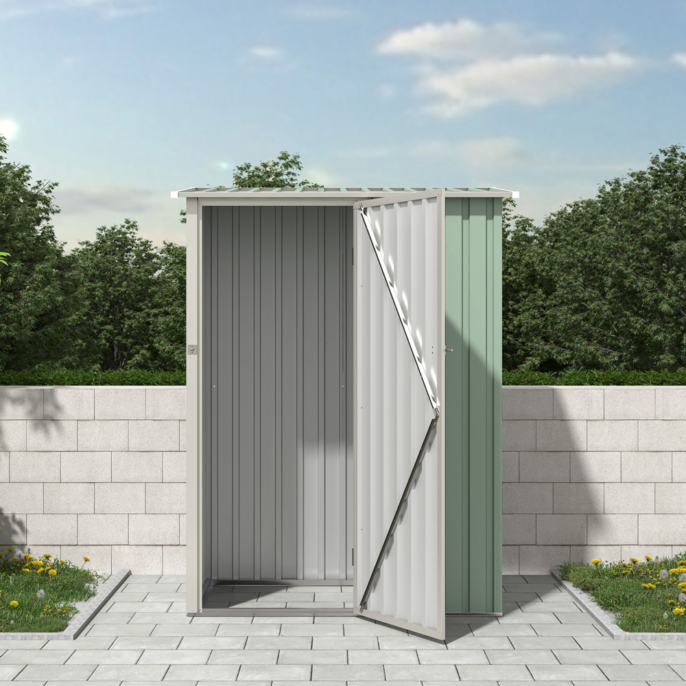 Keep your garden tools and equipment neatly stored in this durable steel garden shed. Its light green body with beige trim complements any garden, while the secure lock keeps your belongings safe. The shed boasts a spacious interior, perfect for lawnmowers, power tools, and small garden furniture. Measuring 4.3 x 2.6m at the base, with a roof overhang of 4.7 x 3m, it offers ample storage. Features include a lockable door (padlock not included, but with pre-drilled holes for one), convenient door handles, a sloped roof for water runoff, and a safety lock. Assembly is required and the shed must be installed on a level wooden platform or concrete base (not included).