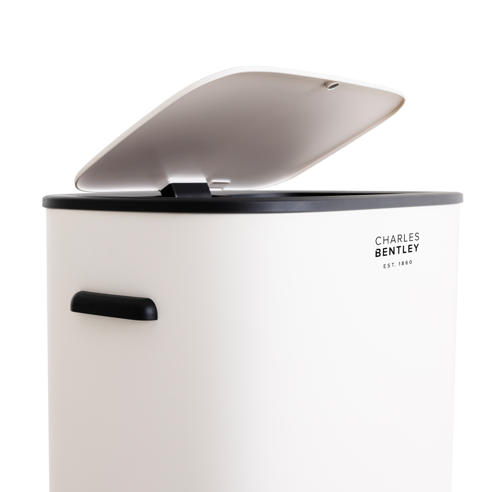 Simplify your day-to-day waste disposal routine with Charles Bentley White Automatic Sensor Bin 55L. Designed to open with just a wave of your hand, it takes the hassle out of throwing stuff away. The smart lid lifts automatically, waits five seconds, then closes on its own without touching. With a generous 55-litre capacity, this slimline bin holds plenty without taking up too much floor space. Two built-in discreet side handles make it easy to lift and move, whether you are rearranging the kitchen or just taking out the waste. The inside includes a neat inner bin ring to keep your bin bag firmly in place and hide any overhanging edges. Finished in a sleek white with black trim and powder-coated steel body, this bin looks the part and stays looking clean given its fingerprint-resistant surface. Just pop in 4 AA batteries (not included), and you are good to go.