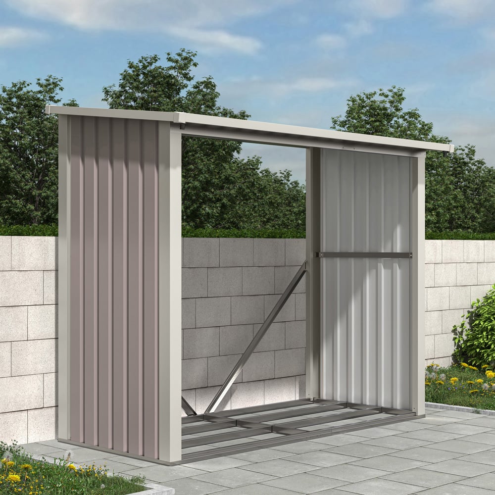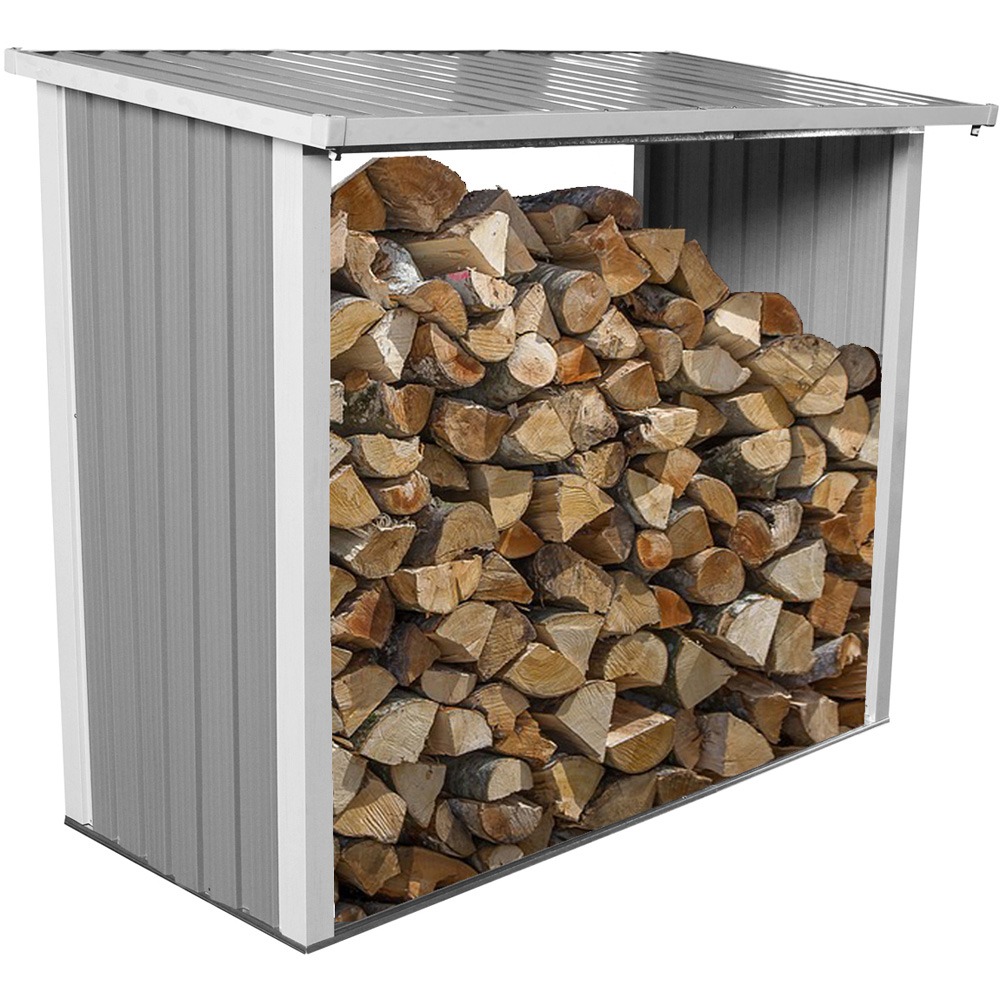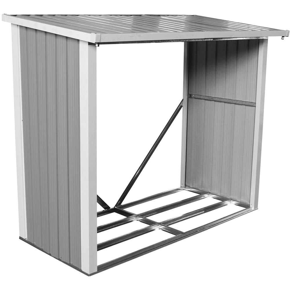 This stylish log store keeps your firewood dry and organised. Made of steel with a light grey finish and beige trim, it's a practical and attractive addition to any outdoor setting. The sturdy design includes supporting back panels to keep logs securely inside, while a sloped roof and raised floor promote air circulation for efficient drying. Dimensions: 6 x 3ft (W182 x D89 x H148cm.