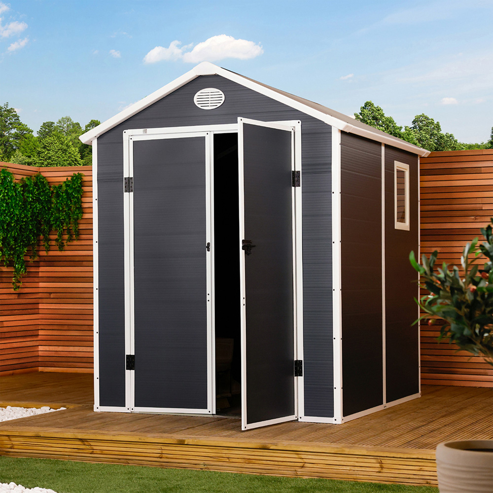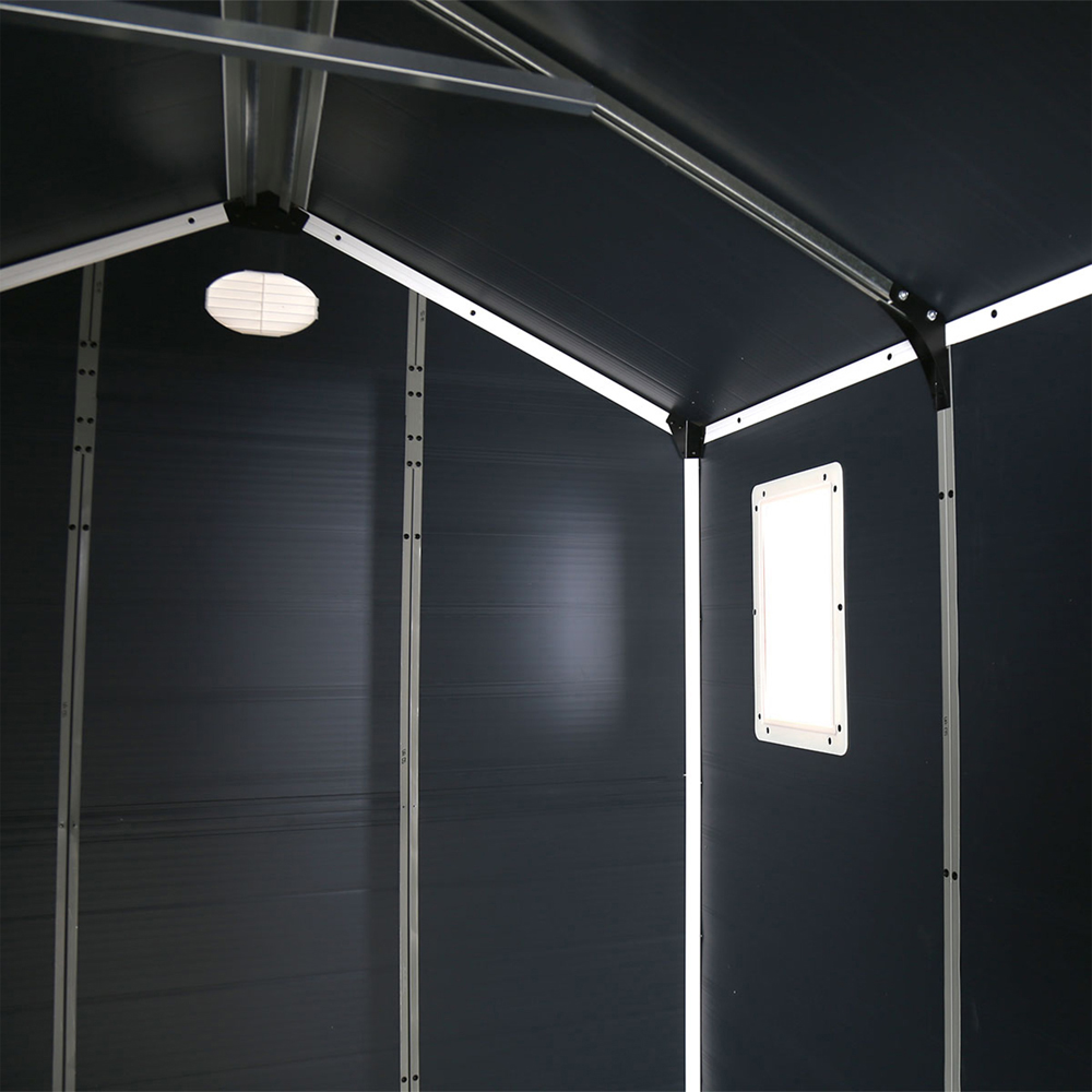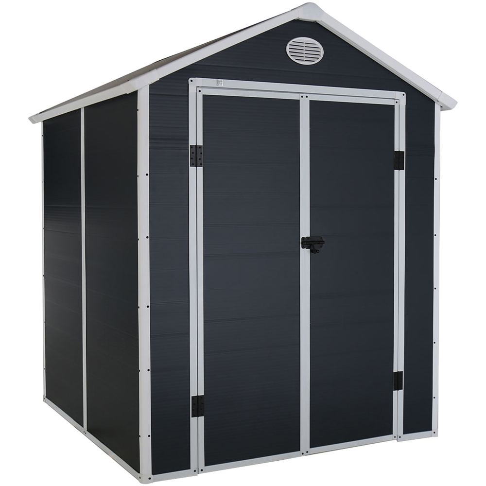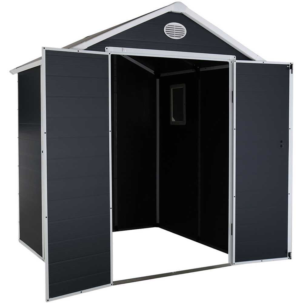 This robust outdoor storage shed from Charles Bentley protects your belongings from the elements. Constructed from durable, waterproof, and weather-resistant plastic with UV protection, this shed provides lasting storage solutions. The design includes a secure door, a window for natural light, ventilation vents, and a padlock hasp for security. Perfect for storing lawnmowers, power tools, or garden furniture, this shed offers ample space. Dimensions: Height 226cm x Length 192cm x Width 190cm (door opening: 119 x 181cm, internal: 180 x 176cm, overall area: 3.65m², frame thickness: 1.5mm, cover thickness: 12mm, window: 35 x 48cm). Assembly is required.
