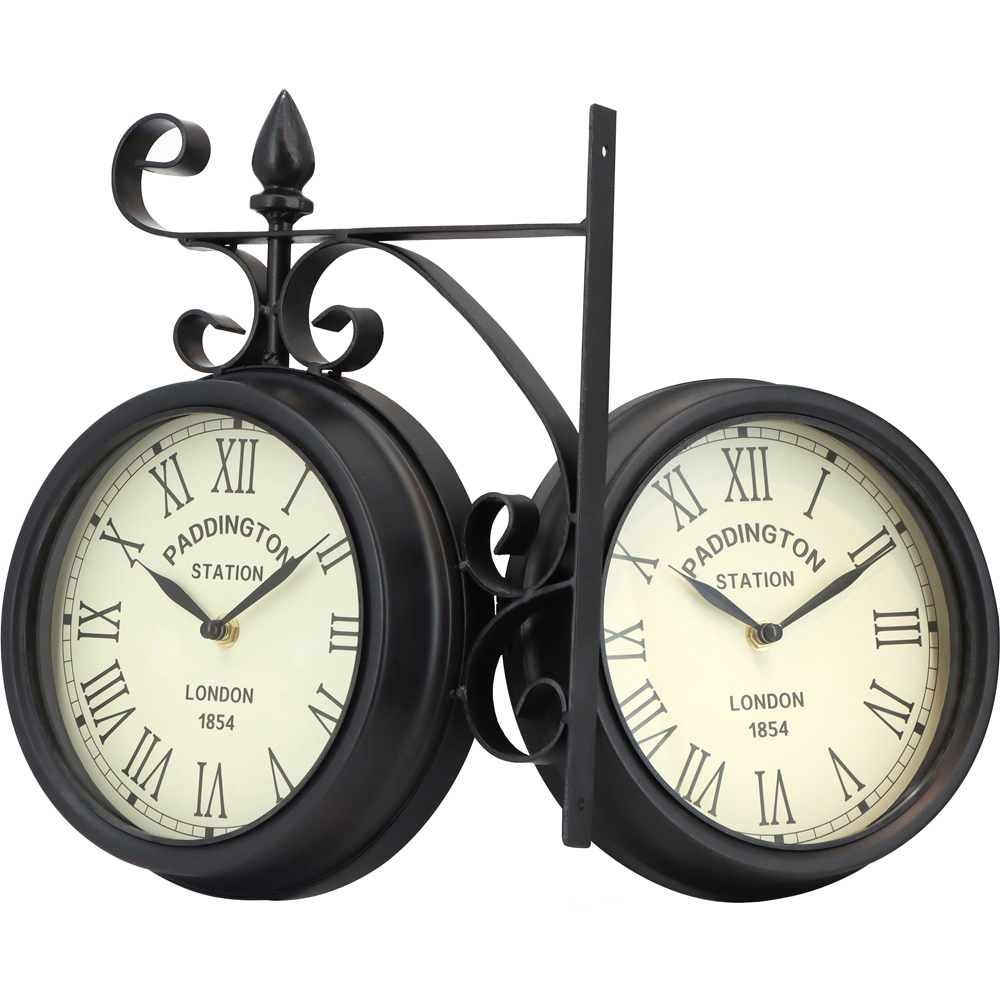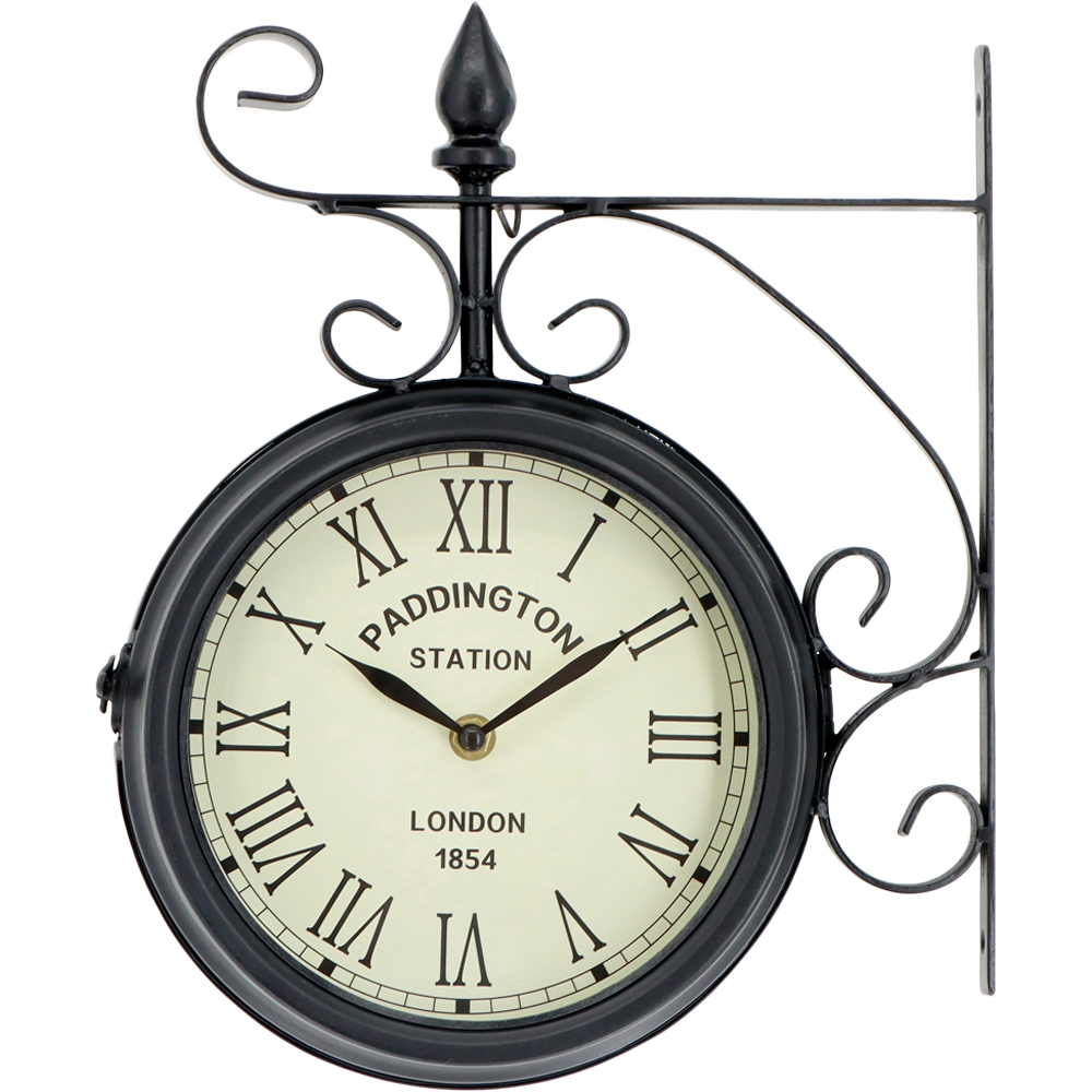 Showcasing an antique aesthetic, this double-sided clock is equally at home indoors or outdoors. Perfect for gardens and patios, its ornate mounting bracket ensures a secure and stylish display. Conveniently including screws and wall fittings, both clock faces are clearly visible. Clock face diameter: 20cm.