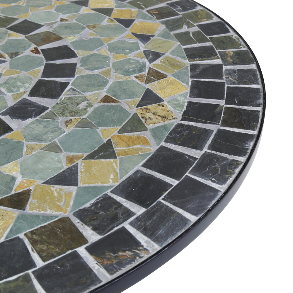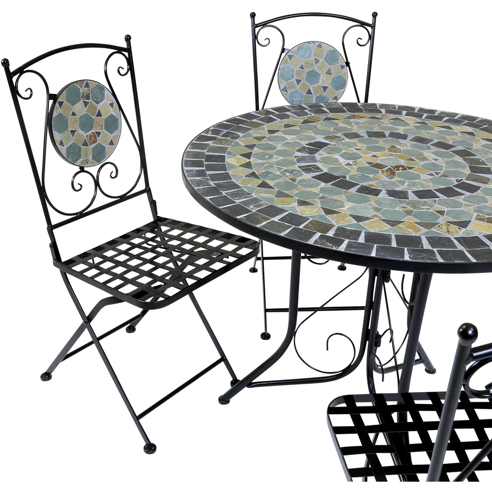 Bring the beauty of the Mediterranean to your patio, garden, or deck with this stunning 5-piece Charles Bentley dining set. The captivating blue mosaic table top and chair backs create a relaxing atmosphere perfect for outdoor entertaining. Built with a durable wrought iron frame for an antique look and a rustproof finish for lasting quality and weather resistance, this 4-seater set includes one round table and four bistro chairs. Dimensions: Table: Dia.90 x H72 cm. Chairs (each): W36 x D35 x H91 cm. Keep your furniture looking its best with one of our durable, waterproof protective covers. Find the perfect fit for your new set.
