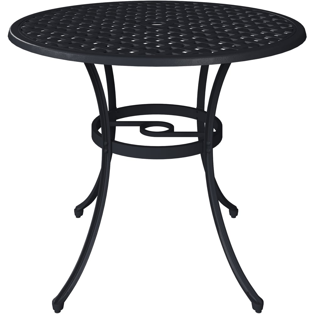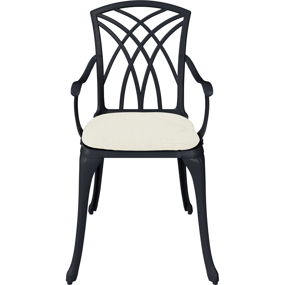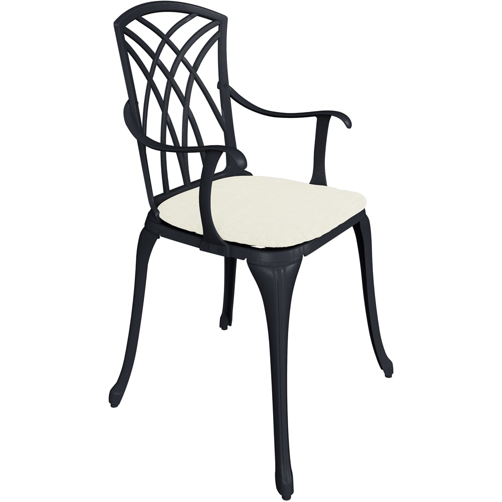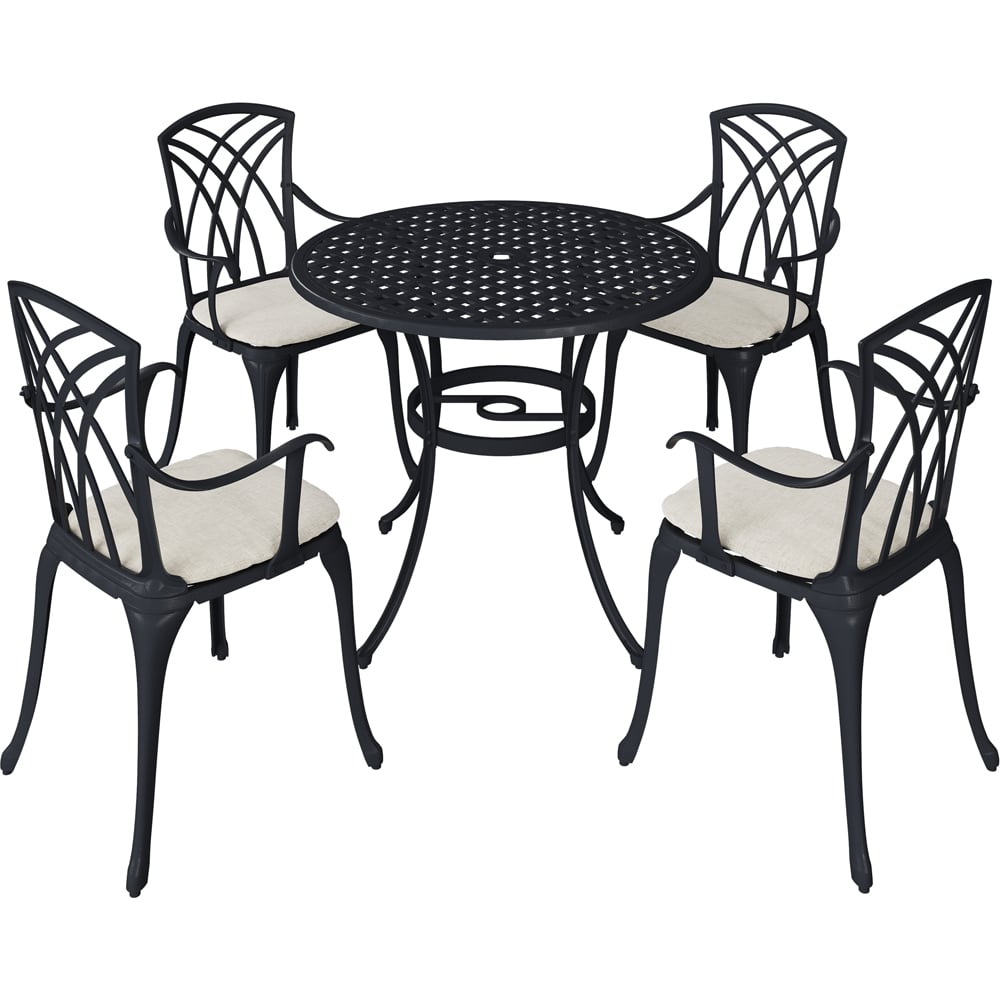 This stylish cast aluminium garden furniture set, with its attractive rustic bronze finish, is perfect for al fresco dining and entertaining. The set comprises a round table, four comfortable armchairs, and four cream cushions, creating a welcoming atmosphere on patios and decking. The table features a central hole (2-inch diameter) for a parasol. Approximate dimensions: Table diameter 85cm x Height 70cm, Armchair Height 89cm x Depth 51.5cm x Width 52cm. Protect your furniture with one of our durable, waterproof garden furniture covers – find your perfect fit here.