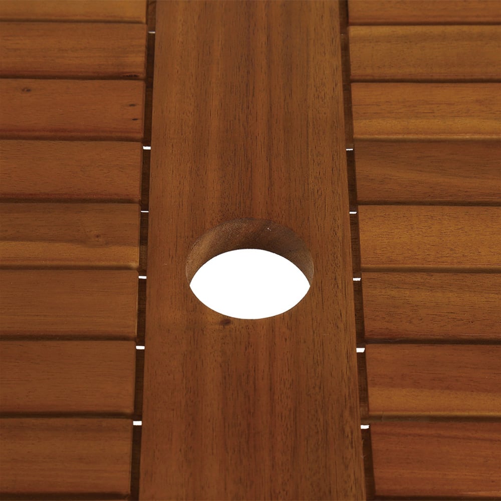 Enjoy al fresco dining with this oval wooden table, perfect for patios and gardens of all sizes. Its convenient central umbrella hole keeps you shaded, while matching chairs are available separately. Note that this table folds down partially. Extend the life of your outdoor furniture with our durable, waterproof garden furniture covers – discover the perfect fit for your table today.
