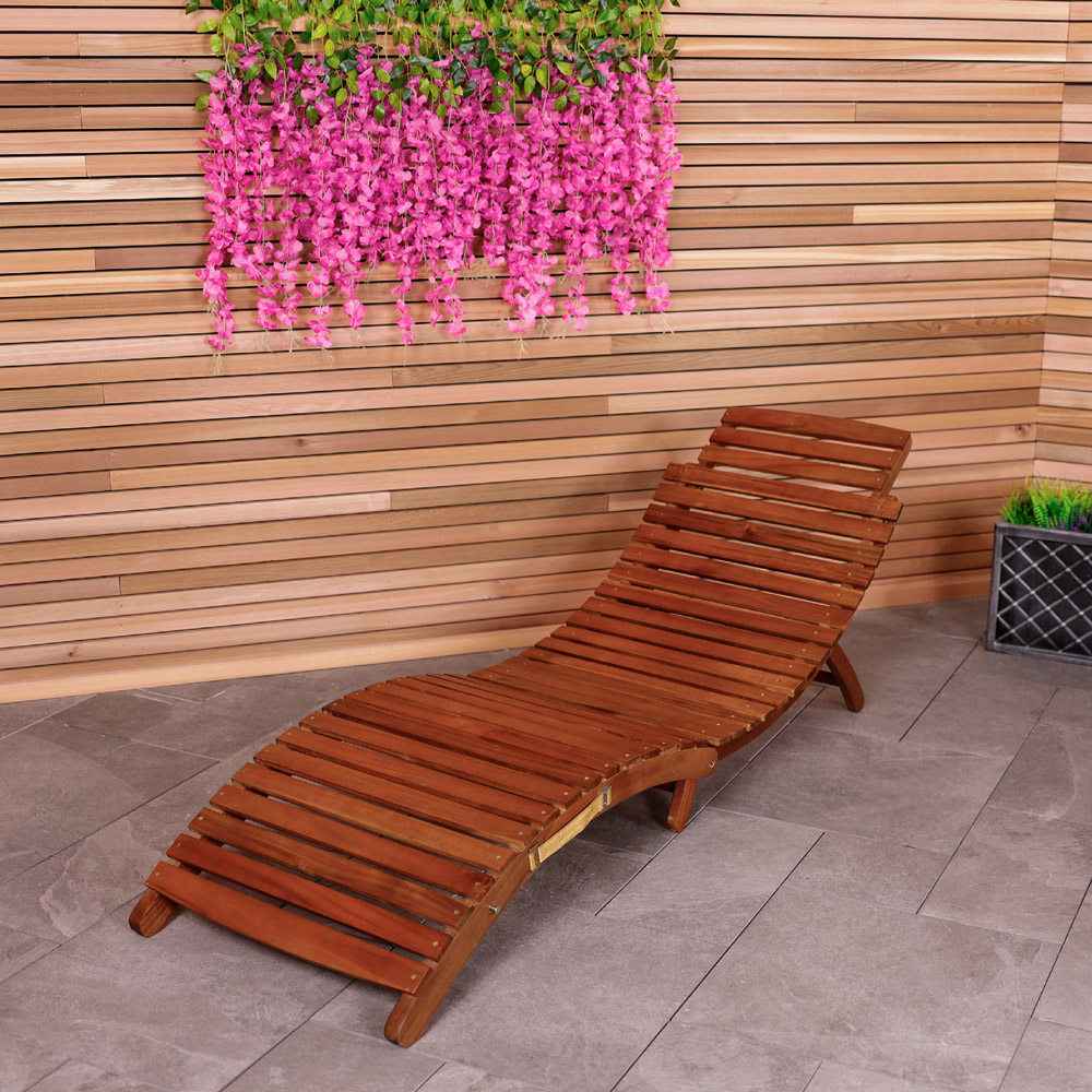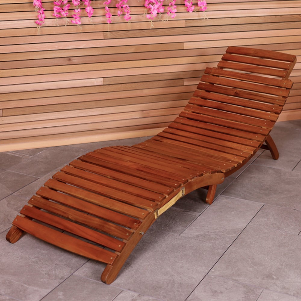Enjoy summer relaxation with this comfortable, foldable sun lounger. Made from FSC-approved acacia wood, it features a single reclining position and a convenient carrying handle. The oil-stained finish enhances the wood's natural colour and protects it from the elements, although undercover storage is recommended when not in use. Its compact, curved design is both space-saving and easy to transport. Protect your investment with one of our durable, waterproof garden furniture covers. Explore our wide range to find the perfect fit. Max User Weight: 110kg.