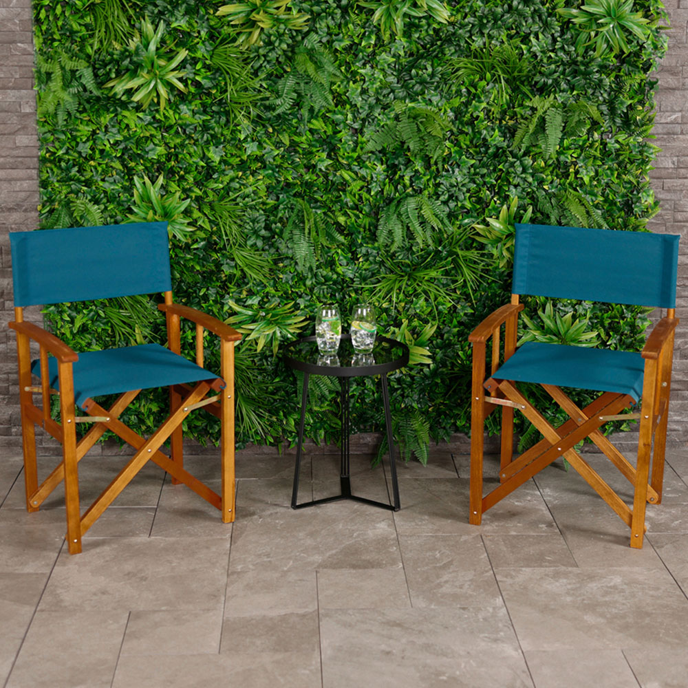Stylish and sophisticated, this pair of teal wooden director's chairs will enhance any patio or garden. Perfect for family camping trips or relaxing days at the beach, these traditionally designed chairs are made from durable, FSC-certified wood and finished with hard-wearing polyester teal fabric. Lightweight and easily foldable for compact storage, they offer both comfort and convenience. Dimensions: H85 x W55 x D54cm. Seat height: 45cm. Extend the life of your chairs with one of our waterproof garden furniture covers.