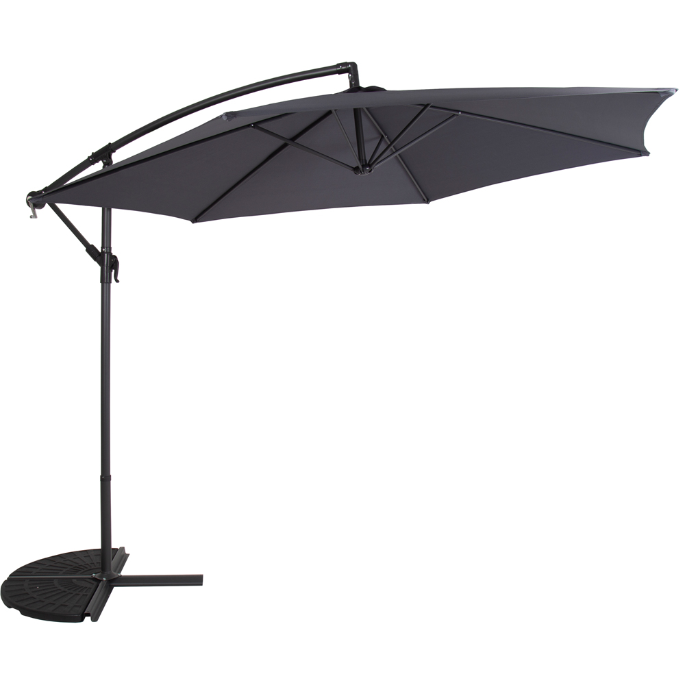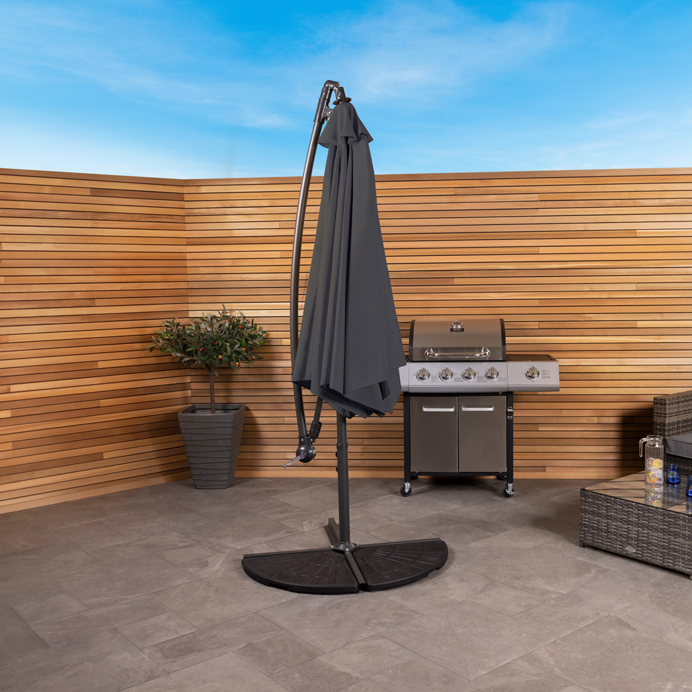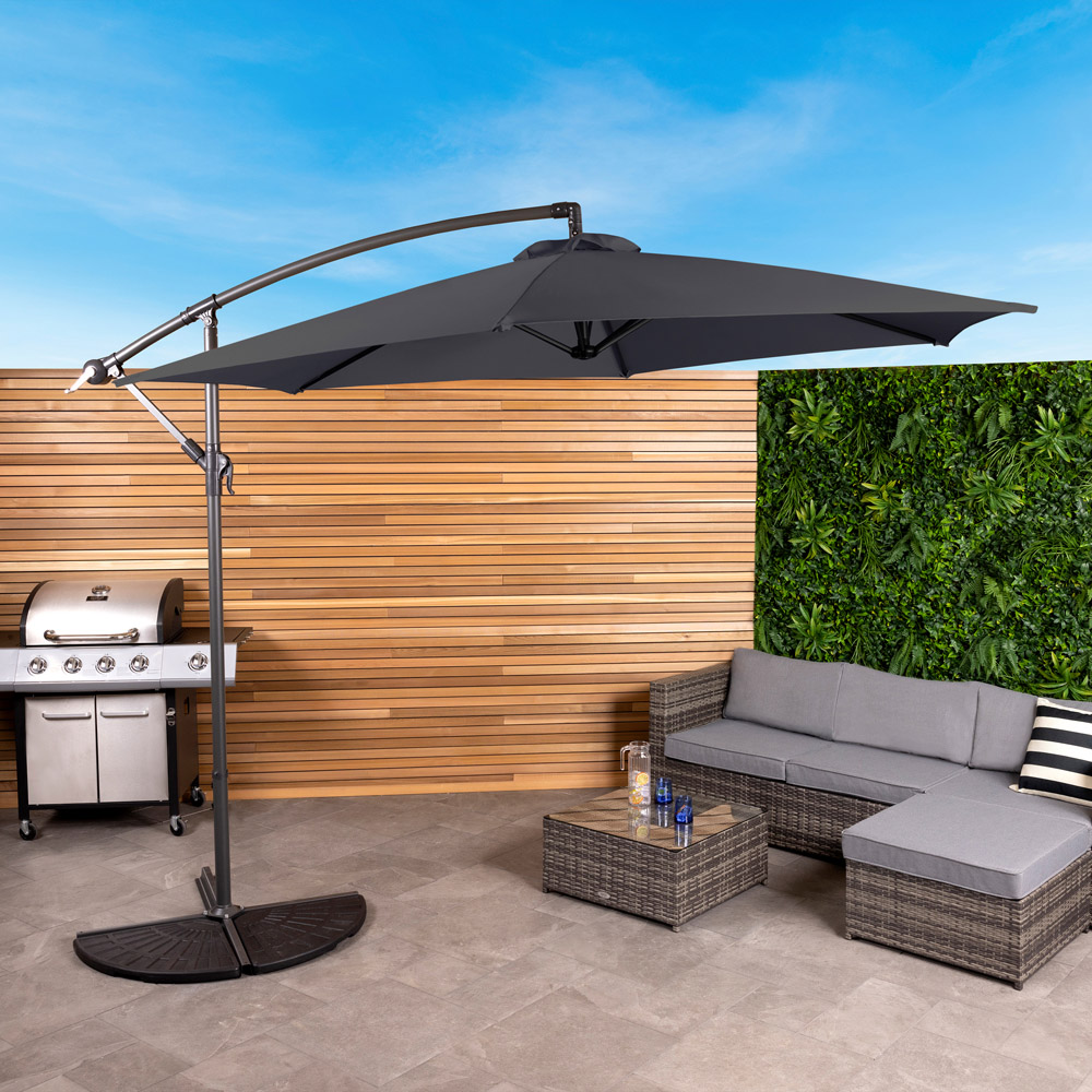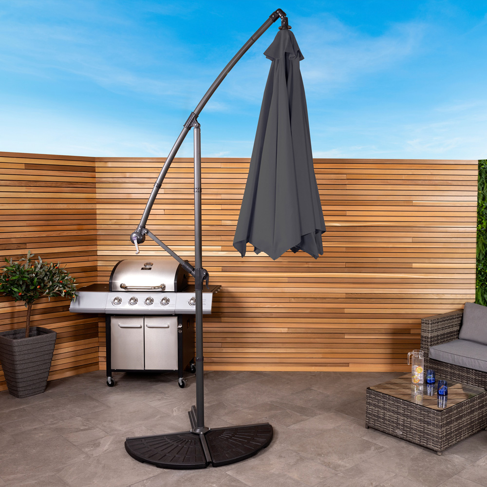 Enjoy shade anywhere in your garden with this freestanding hanging umbrella. Perfect for hot tubs, barbecues, or patio furniture, it shields you from sun and rain. Built for the outdoors, its durable, corrosion-resistant design stands up to the elements. A separate weight is needed for secure placement (sold separately). Dimensions: H340 x L320 x W300cm, Canopy span: 3m, Pole diameter: 48mm. Packaged: W32 x D15 x H200cm. Assembled: Dia.300 x H230cm (approx.) We endeavour to reflect colours as closely as possible in our images but please note, colours may differ slightly from how it appears on your device due to varying screen settings.