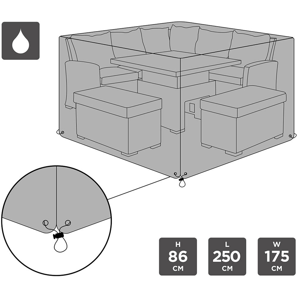 Protect your outdoor furniture from dust, dampness and dirt with Charles Bentley Furniture Cover. This large deluxe black polyester cover is waterproof, heavy-duty, durable and has an easy-wipe finish. It also comes with aluminium eyelets and a cord with a toggle for ease of use. Dimensions: L250 X W175 X H86cm.