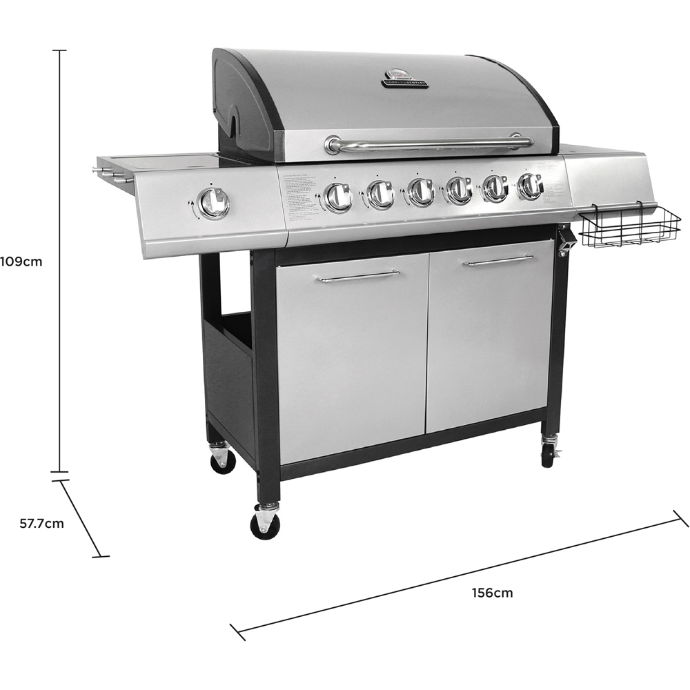 This powerful gas barbecue is perfect for large family gatherings and any sized garden. Six individually ignitable burners provide diverse temperature zones for versatile cooking, complemented by a large cooking area and an additional side burner. A full-length warming rack and hood thermometer ensure precise temperature control, while the double-layered hood keeps food warm for up to 30 minutes after cooking. Convenient features include side tables for food prep, a removable drip tray for easy cleaning, and ample storage with a double cupboard, utensil hooks, and a sauce rack. Four castor wheels with brakes allow easy movement. Durable, heat and flame-resistant paint ensures longevity. Specifications: UK standard CE approved regulator with 0.8m hose, 24.3Kw Total Power, 3.6kW per main burner (6), 2.7kW per side burner (1), Dimensions: H110 x L152.5 x D58cm, Large cooking area: 83 x 45cm. Includes: fixed bottle opener, four castor wheels with brakes, side table, removable grease tray, stainless steel front doors with bottom shelf, three utensil hooks, two steel cooking grids, thermometer, and stainless steel warming rack. Protect your BBQ with our premium BBQ covers.