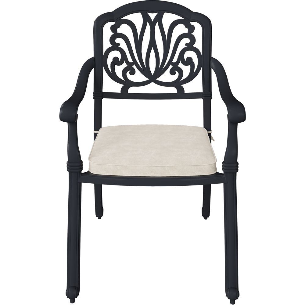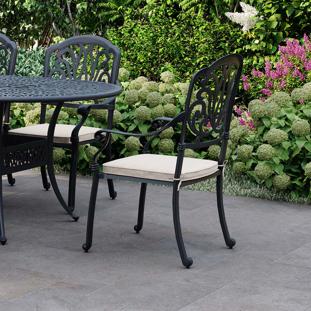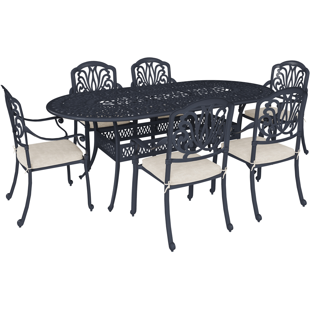 Enjoy al fresco dining with this 7-piece cast aluminium garden furniture set. Its classic matt black finish and elegant filigree detailing on the table and chairs create a stylish look perfect for entertaining. Six comfortable armchairs surround a large oval table, all complemented by six thick beige cushions. The set's soft lines will beautifully enhance your patio or garden. Extend the life of your furniture with one of our durable, waterproof garden furniture covers, find the perfect fit for your needs here.