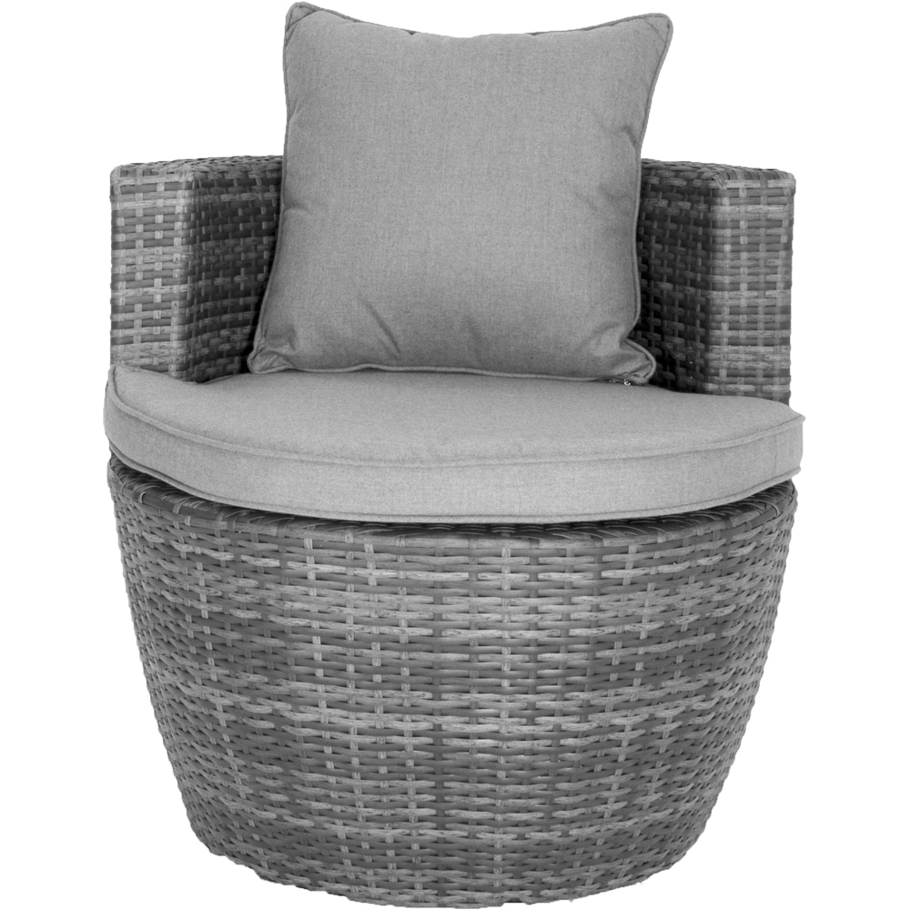 This stylish three-piece rattan stacking set is perfect for creating the ideal outdoor retreat. Two comfortable chairs and a table with a toughened glass top provide ample seating for friends and family. The ingenious stackable design makes storage a breeze. Constructed from robust variegated rattan and aluminium, this weatherproof set is built to last. Available in grey (also in natural), its contemporary design enhances any patio or garden. The fireproof fabric provides added peace of mind. Rattan thickness: 1.2mm. PVC Coated Polyester 300 x 600D. Table: Dia. 52 x H46cm, Chair: Dia. 72 x H73cm. Protect your investment with our selection of durable, waterproof garden furniture covers.