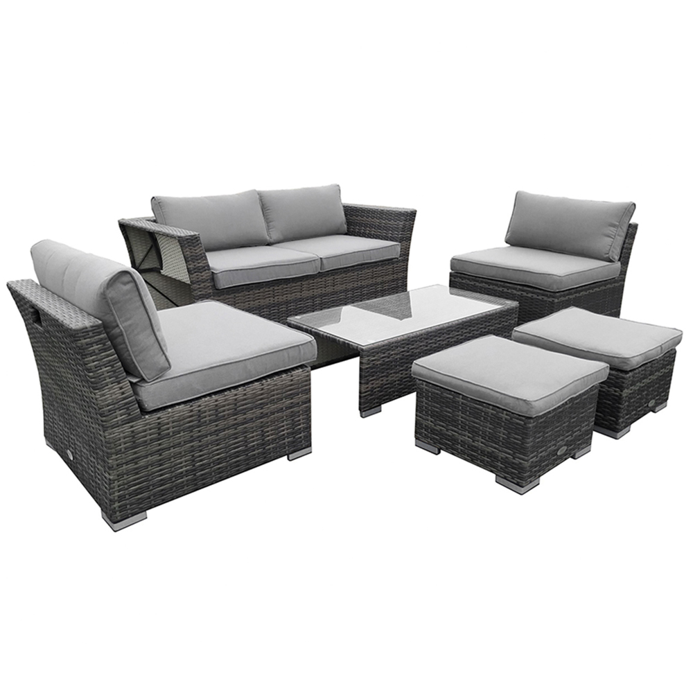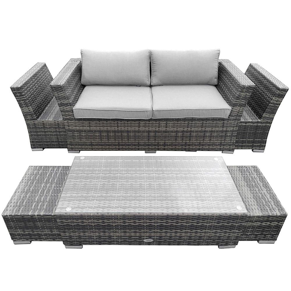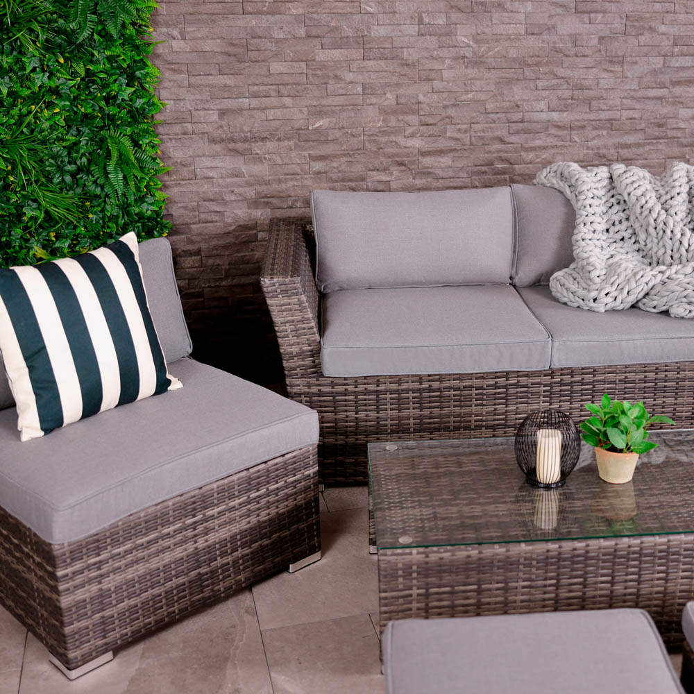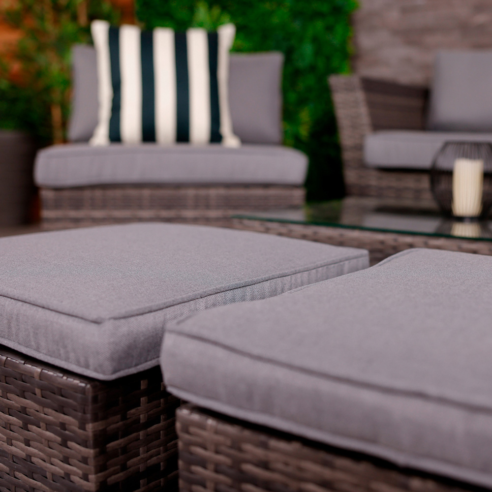 Elevate your outdoor experience with the chic Charles Bentley rattan lounge set, an ideal choice for any garden, patio, or conservatory. This adaptable set, made from robust light grey rattan, seamlessly fits into contemporary outdoor settings, making it perfect for everything from elegant dining to relaxed drinks and quick snacks. The multifunctional table not only serves as a centrepiece but also provides handy storage for the stools, keeping your area tidy. Enjoy comfort with the generously padded 8cm thick grey cushions included for both the chairs and sofa, as well as for each stool, ensuring a cosy atmosphere for all your gatherings. Designed with space efficiency in mind, this lounge set allows for maximum enjoyment with loved ones while easily stacking away when it's time to clean up. The dimensions are thoughtfully crafted for your comfort: chairs measure H63 x W68 x D75cm, the sofa H63 x W157 x D75cm, stools H25 x W44 x D44cm, and the table H30 x W101 x D51cm. Safeguard your outdoor furniture with our sturdy and waterproof garden furniture covers. Browse our wide selection of heavy-duty Garden Furniture covers to find the ideal fit for your needs.