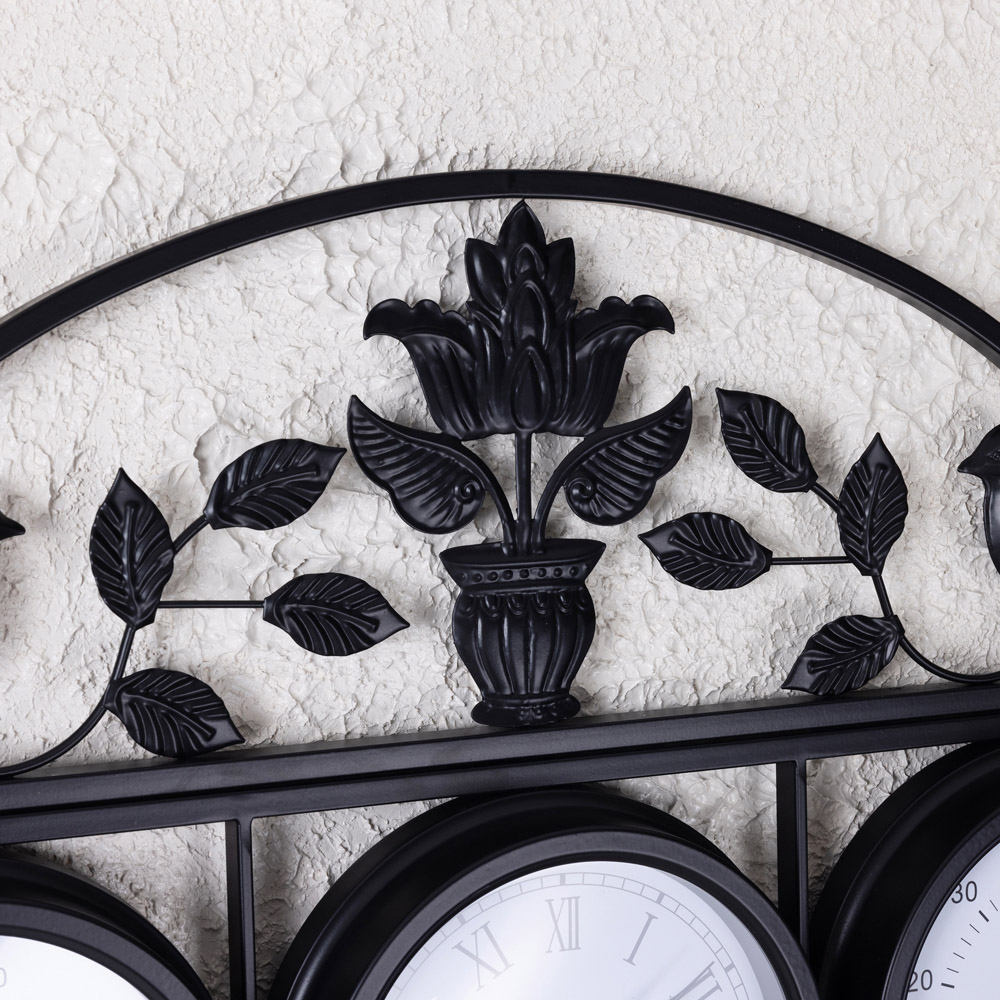 This charming vintage-style garden clock boasts a shabby chic distressed dark grey finish. Its three faces – a clock, thermometer, and hygrometer – provide practical information alongside its decorative appeal. Measuring 15cm in diameter, the clock face is complemented by overall dimensions of 52cm L x 5cm W x 36cm H. Conveniently supplied with screws and wall fittings for quick and easy installation.